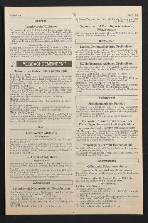 Am Samstag, dem 13.08.1994, um 15.30 Uhr empfängt unsere I. Mannschaft den Gegner aus Elbert in Heiligenroth (1. Meisterschaftsspiel).