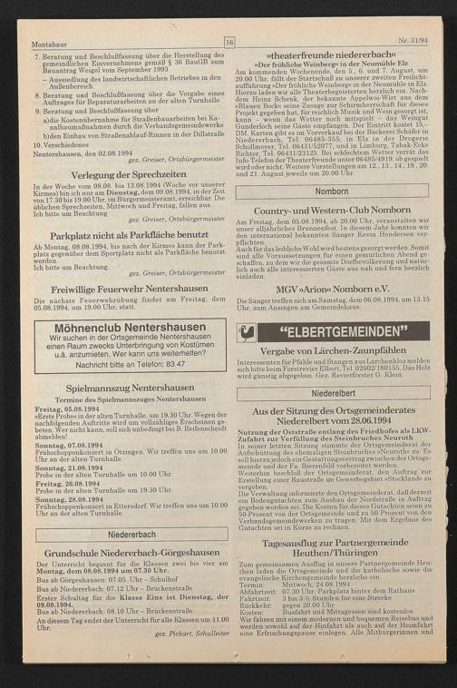 Aus der Sitzung des Ortsgemeinderates Niederelbert vom 28.06.1994