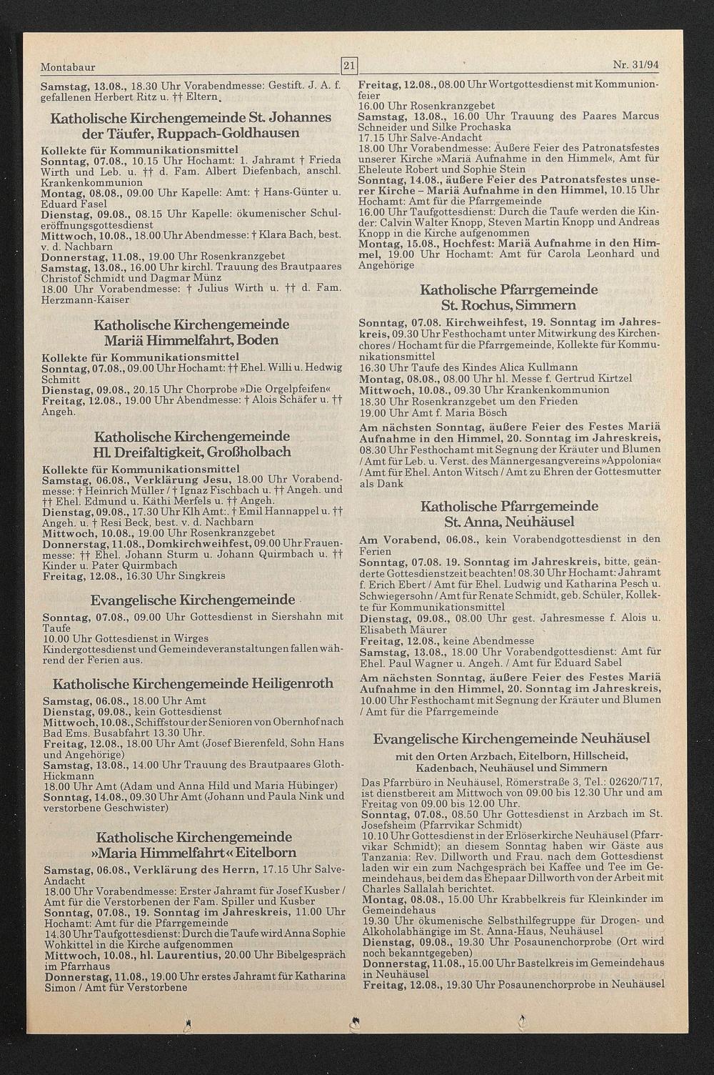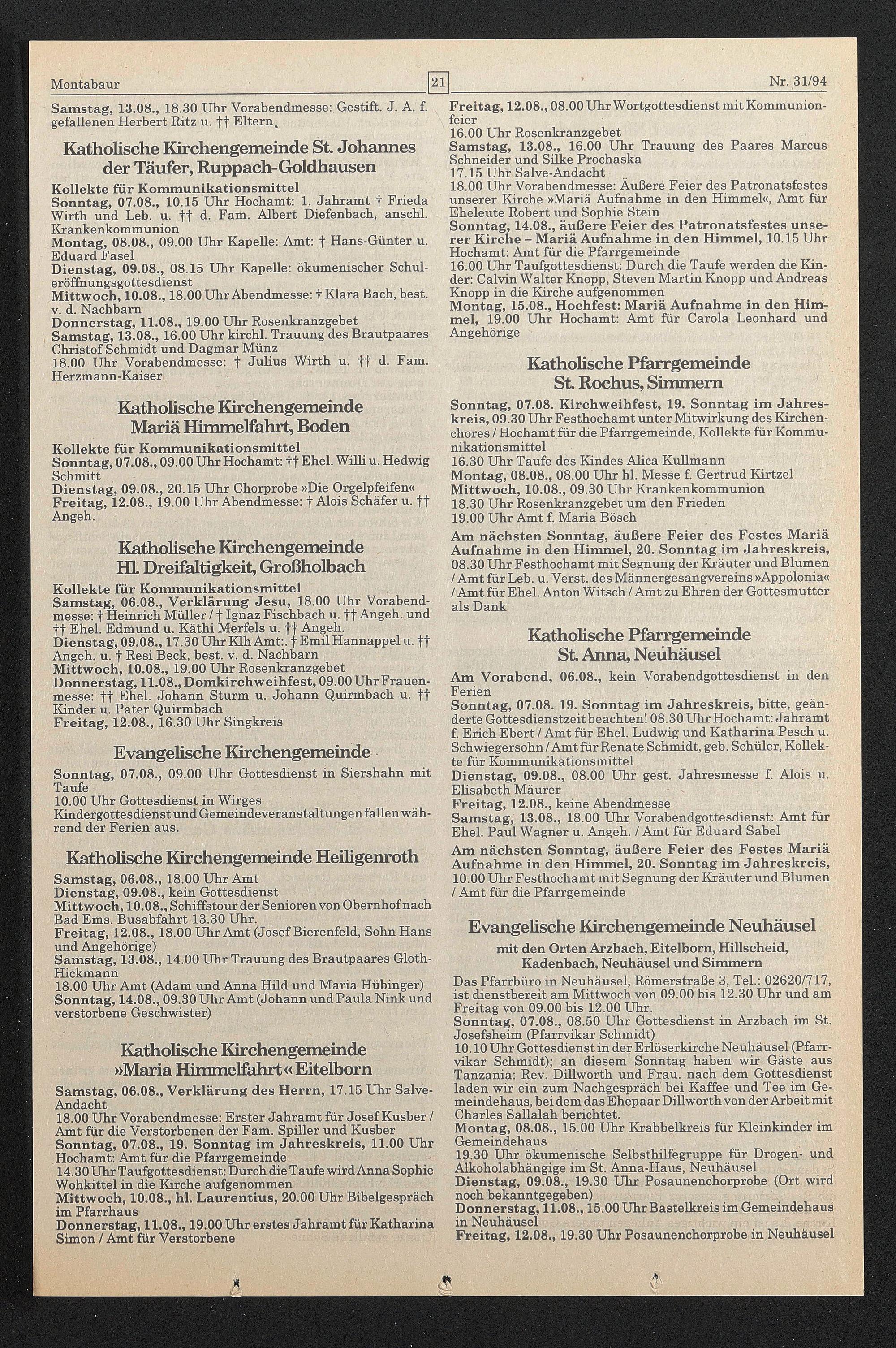 18.00 Uhr Amt (Adam und Anna Hild und Maria Hübinger) Sonntag, 14.08., 09.30 Uhr Amt (Johann und Paula Nink und verstorbene Geschwister)