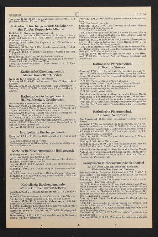 19.30 Uhr ökumenische Selbsthilfegruppe für Drogen- und Alkoholabhängige im St. Anna-Haus, Neuhäusel Dienstag, 09.08., 19.30 Uhr Posaunenchorprobe (Ort wird noch bekanntgegeben)
