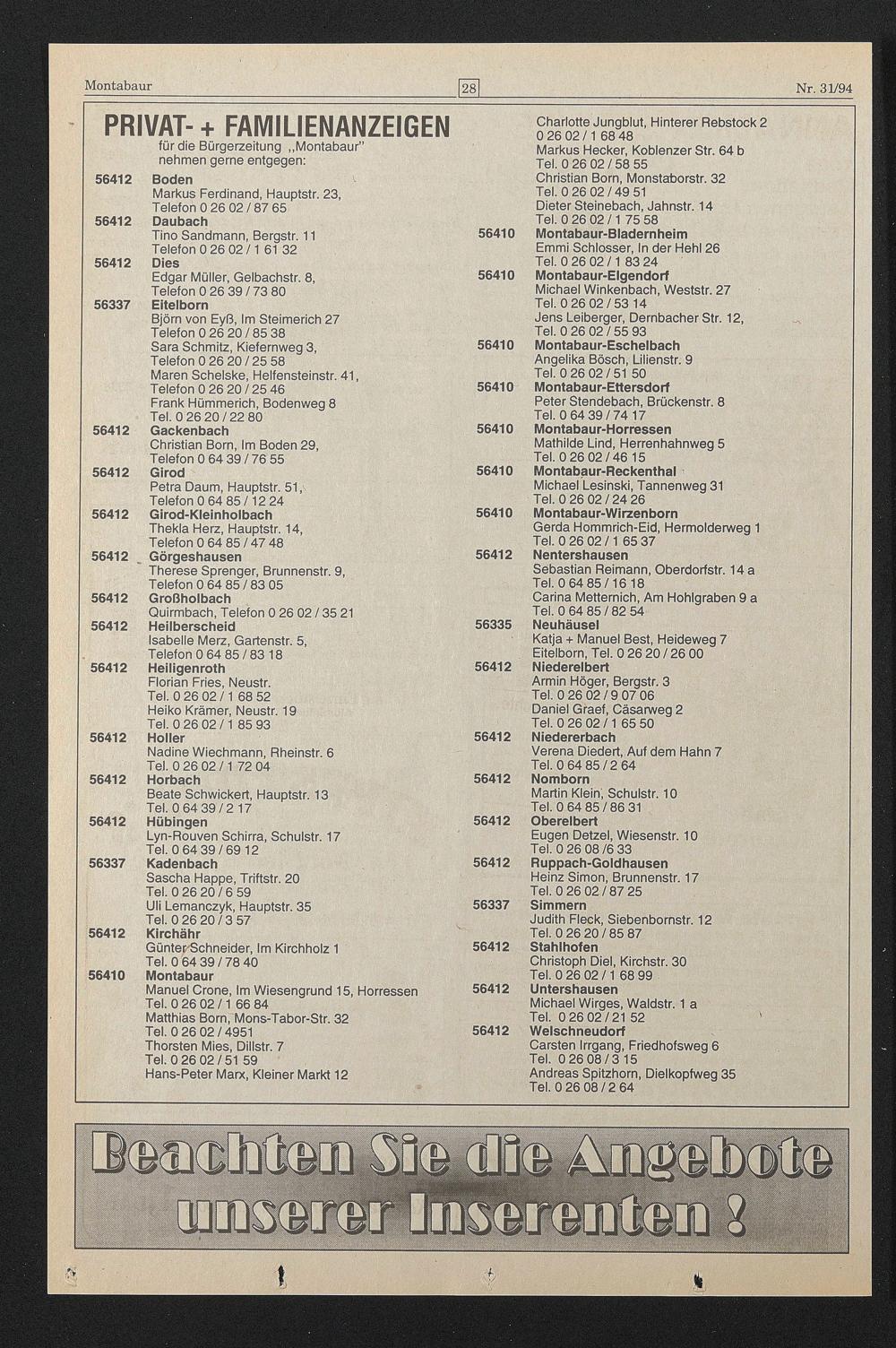 für die Bürgerzeitung „Montabaur” nehmen gerne entgegen: