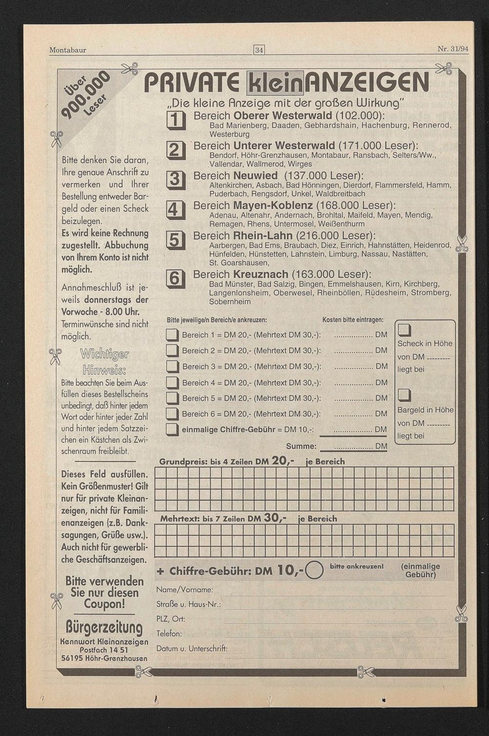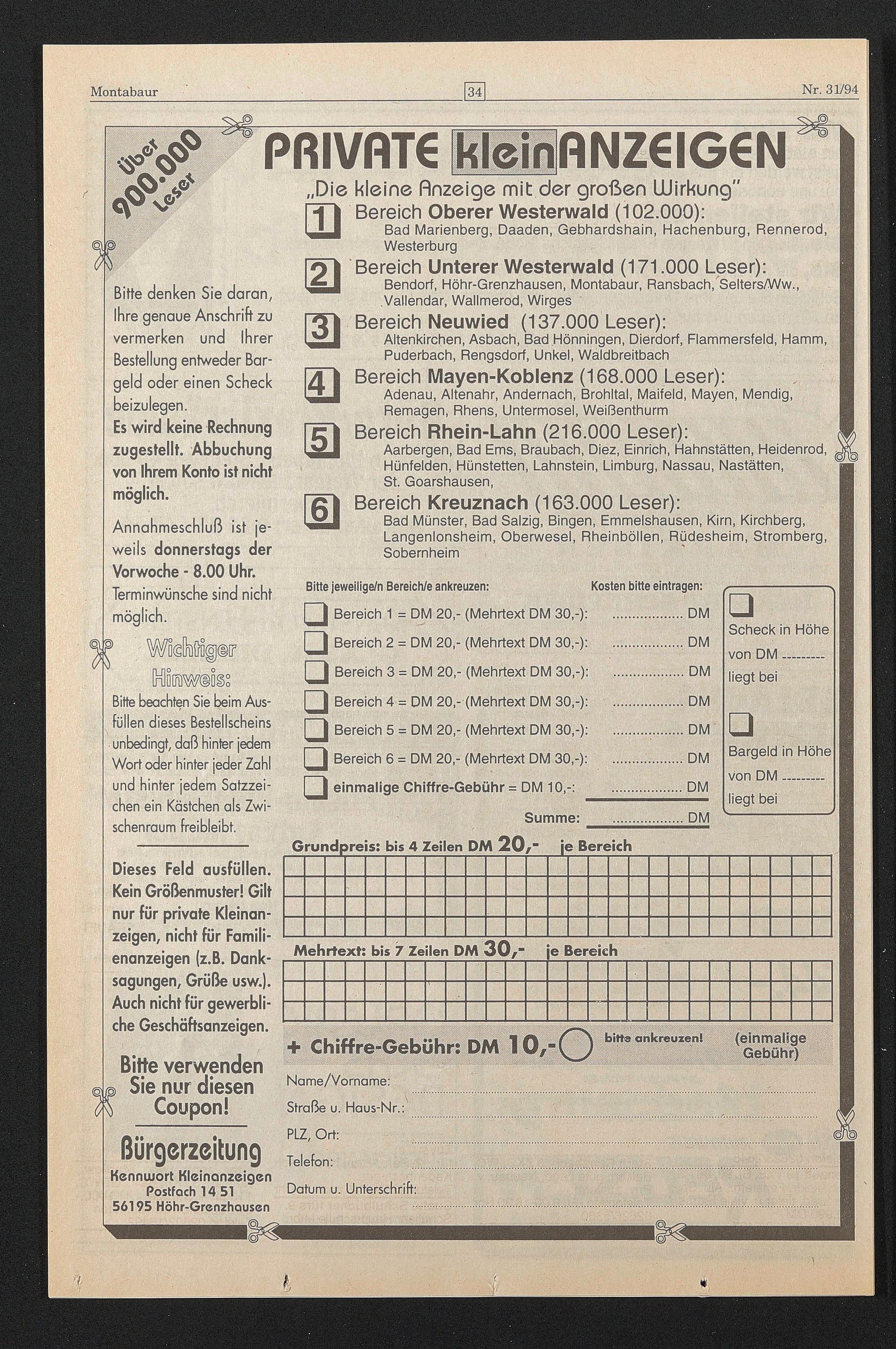 Annahmeschluß ist jeweils donnerstags der Vorwoche - 8.00 Uhr.