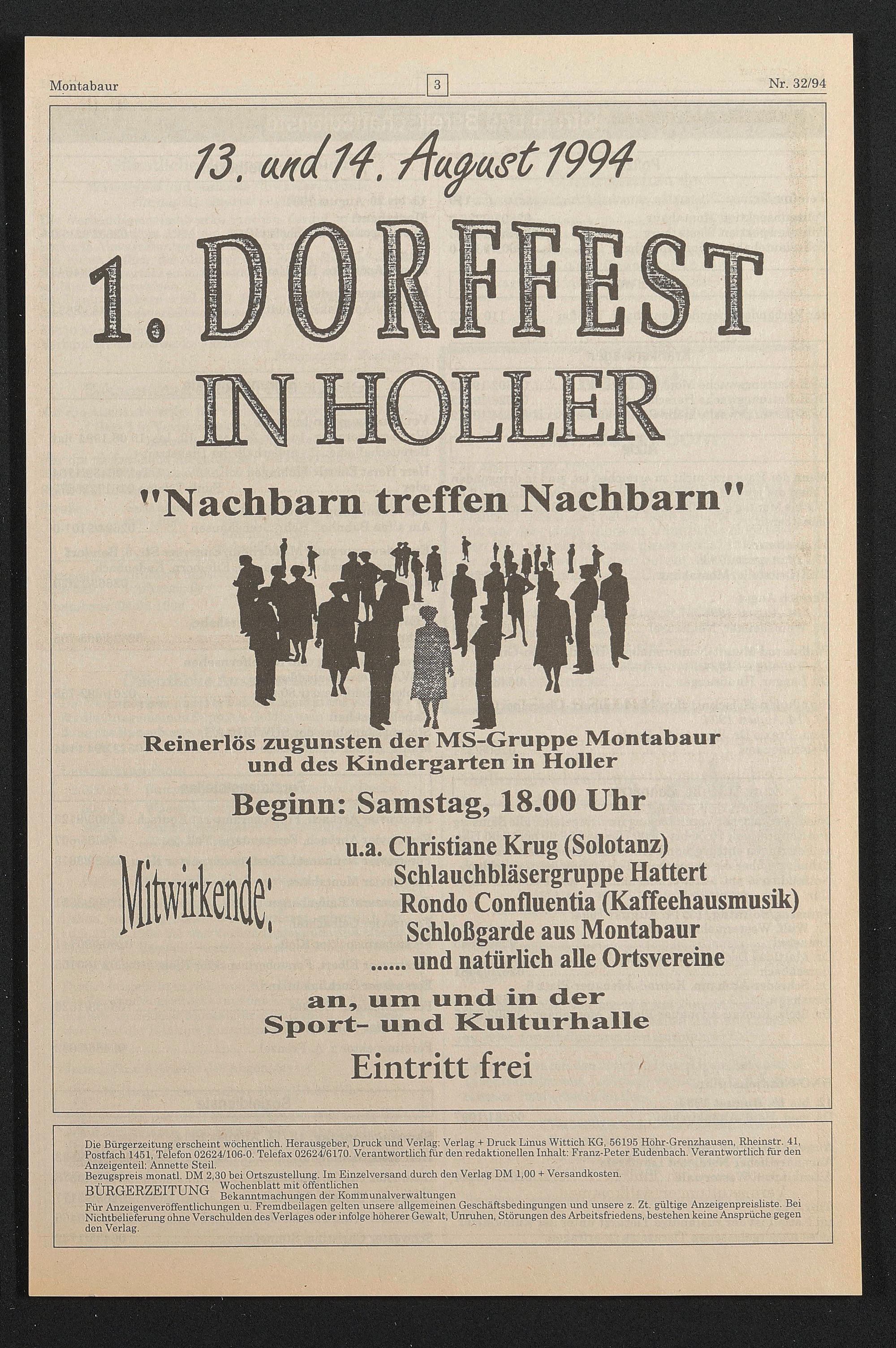 Die Bürgerzeitung erscheint wöchentlich. Herausgeber, Druck und Verlag: Verlag + Druck Linus Wittich KG, 56195 Höhr-Grenzhausen, Rheinstr. 41, Postfach 1451, Telefon 02624/106-0. Telefax 02624/6170. Verantwortlich für den redaktionellen Inhalt: Franz-Peter Eudenbach. Verantwortlich für den Anzeigenteil: Annette Steil.