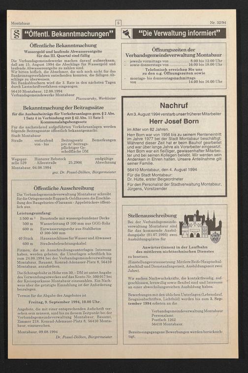 Herr Born war von 1956 bis zu seinem Renteneintritt im Jahre 1977 bei der Stadt Montabaur beschäftigt. Während dieser Zeit hat er beim Bauhof gearbeitet und war über lange Jahre als Vorarbeiter eingesetzt. Herr Born war ein fleißiger, gewissenhafter Mitarbeiter und bei seinen Kollegen beliebt. Wir werden sein Andenken in Ehren halten. Unsere Anteilnahme gilt seiner Familie.