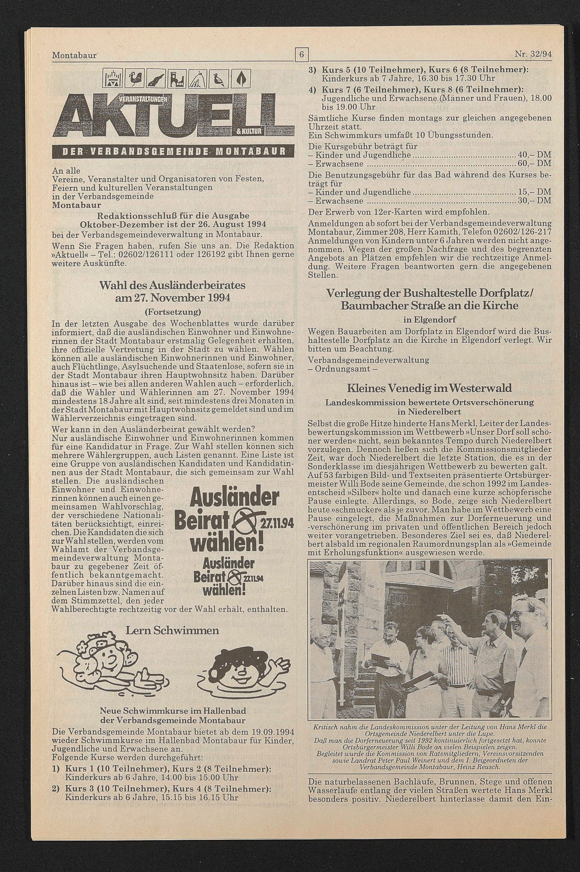Redaktionsschluß für die Ausgabe Oktober-Dezember ist der 26. August 1994 bei der Verbandsgemeindeverwaltung in Montabaur.