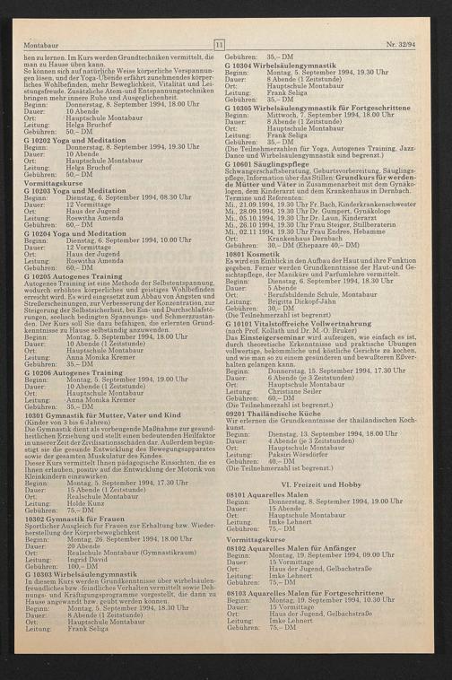 Sportlicher Ausgleich für Frauen zur Erhaltung bzw. Wiederherstellung der Körperbeweglichkeit Beginn: Montag, 26. September 1994, 18.00 Uhr