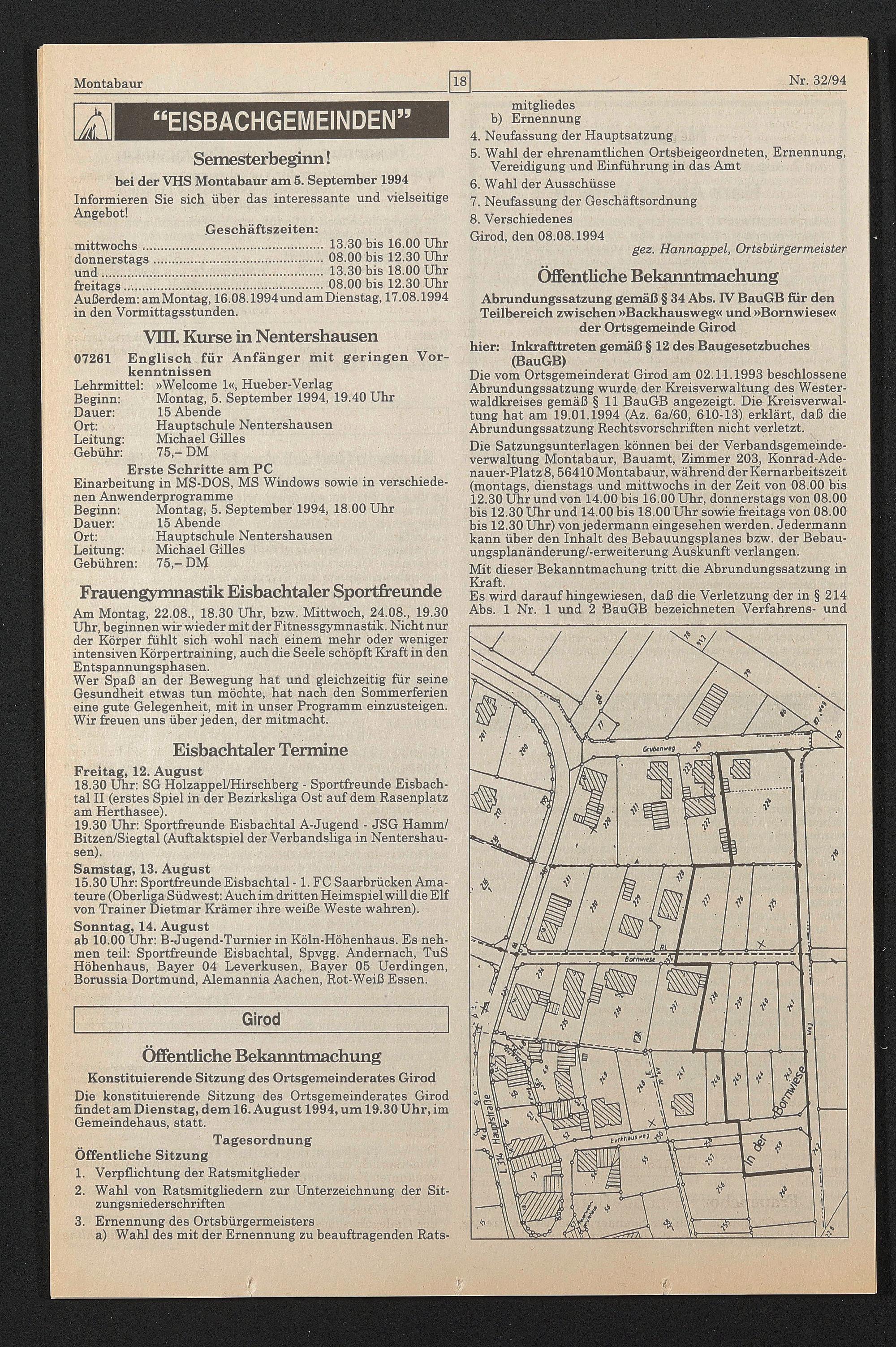 Die konstituierende Sitzung des Ortsgemeinderates Girod findet am Dienstag, dem 16. August 1994, um 19.30 Uhr, im Gemeindehaus, statt.