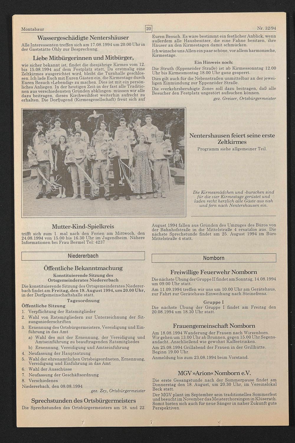 wie sicher bekannt ist, findet die diesjährige Kirmes vom 12. bis 15.08.1994 auf dem Festplatz statt, Da erstmalig eine Zeltkirmes äusgerichtet wird, bleibt die Turnhalle geschlossen. Ich lade Euch mit Euren Gästen ein, die Kirmestage durch Euren Besuch »Lebendig« zu machen. Dies ist mit ein persönliches Anliegen. In der heutigen Zeit-in der fast alle Traditionen aus verschiedensten Gründen abklingen- müssen wir alle dazu beitragen, dieses Kirchweihfest weiterhin aufrecht zu erhalten. Die Dorfjugend (Kirmesgesellschaft) freut sich auf