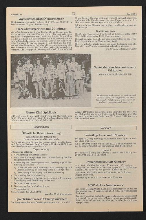 Konstituierende Sitzung des Ortsgemeinderates Niedererbach Die konstituierende Sitzung des Ortsgemeinderates Niedererbach findet am Freitag, den 19. August 1994, um 20.00 Uhr, in der Dorfgemeinschaftshalle statt.