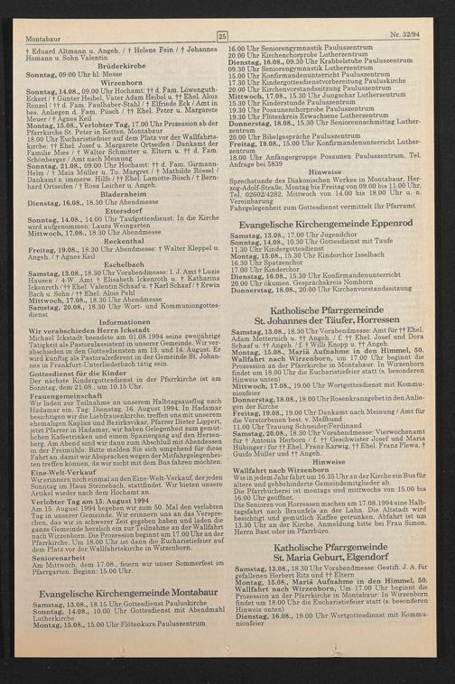 Wir laden zur Teilnahme an unserem Halbtagsausflug nach Hadamar ein. Tag: Dienstag, 16. August 1994. In Hadamar besichtigen wir die Liebfrauenkirche, treffen uns mit unserem ehemaligen Kaplan und Bezirksvikar, Pfarrer Dieter Lippert, jetzt Pfarrer in Hadamar, wir haben Gelegenheit zum gemütlichen Kafeetrinken und einem Spaziergang auf den Herzenberg. Am Abend sind wir dann zum Abschluß mit Abendessen in der Freimühle. Bitte melden Sie sich umgehend für diese Fahrt an, damit wir Absprachen wegen der Mitfahrgelegenheiten treffen können, da wir nicht mit dem Bus fahren möchten.