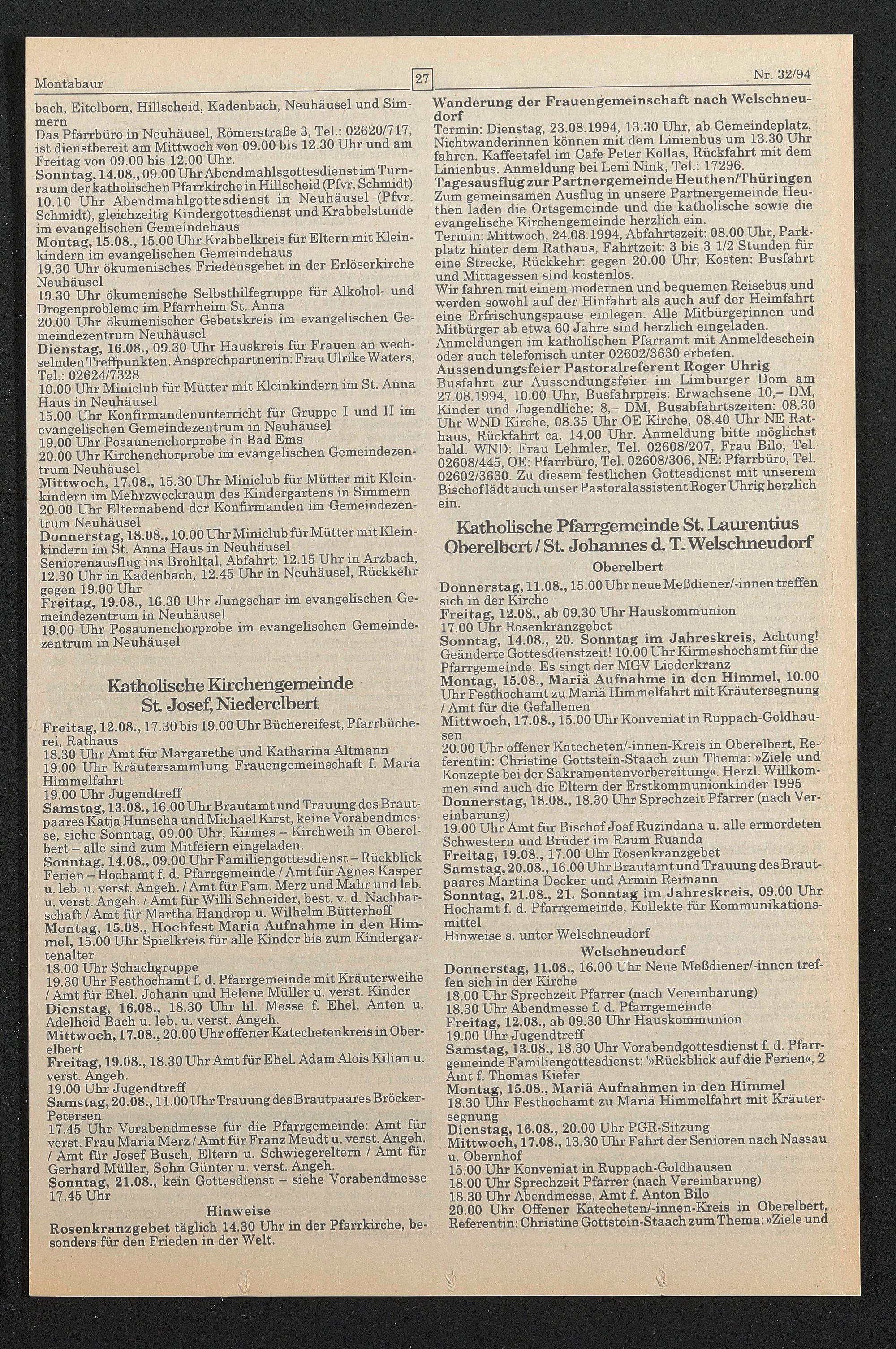 Wir fahren mit einem modernen und bequemen Reisebus und werden sowohl auf der Hinfahrt als auch auf der Heimfahrt eine Erfrischungspause einlegen. Alle Mitbürgerinnen und Mitbürger ab etwa 60 Jahre sind herzlich eingeladen. Anmeldungen im katholischen Pfarramt mit Anmeldeschein oder auch telefonisch unter 02602/3630 erbeten. Aussendungsfeier Pastoralreferent Roger Uhrig Busfahrt zur Aussendungsfeier im Limburger Dom am 27.08.1994, 10.00 Uhr, Busfahrpreis: Erwachsene 10,- DM, Kinder und Jugendliche: 8,- DM, Busabfahrtszeiten: 08.30 Uhr WND Kirche, 08.35 Uhr OE Kirche, 08.40 Uhr NE Rathaus, Rückfahrt ca. 14.00 Uhr. Anmeldung bitte möglichst bald. WND: Frau Lehmler, Tel. 02608/207, Frau Büo, Tel. 02608/445, OE: Pfarrbüro, Tel. 02608/306, NE: Pfarrbüro, Tel. 02602/3630. Zu diesem festlichen Gottesdienst mit unserem Bischof lädt auch unser Pastoralassistent Roger Uhrig herzlich ein.