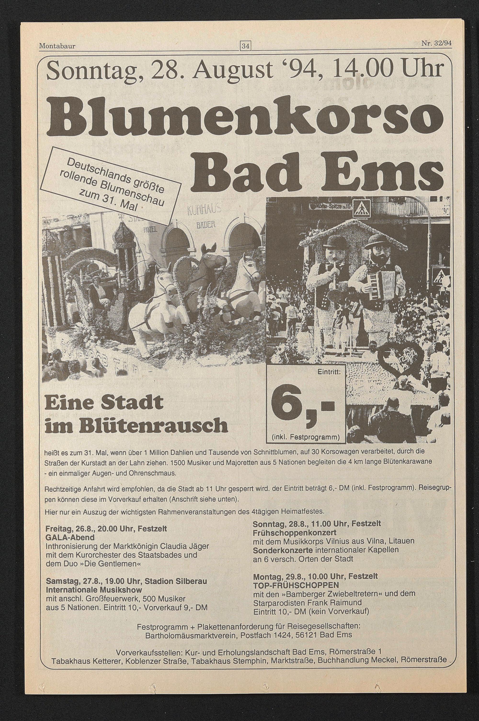 Vorverkaufsstellen: Kur- und Erholungslandschaft Bad Ems, Römerstraße 1 Tabakhaus Ketterer, Koblenzer Straße, Tabakhaus Stemphin, Marktstraße, Buchhandlung Meckel, Römerstraße