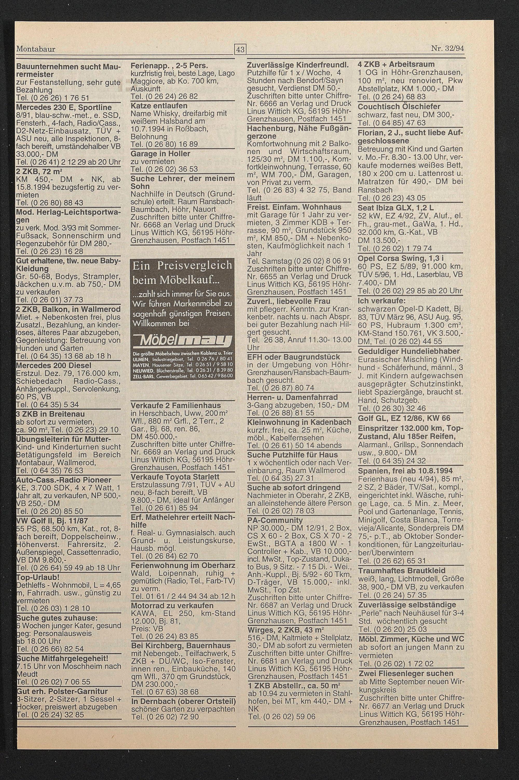 Tel. Samstag (0 26 02) 8 06 91 Zuschriften bitte unter Chiffre- Nr. 6655 an Verlag und Druck Linus Wittich KG, 56195 Höhr- Grenzhausen, Postfach 1451