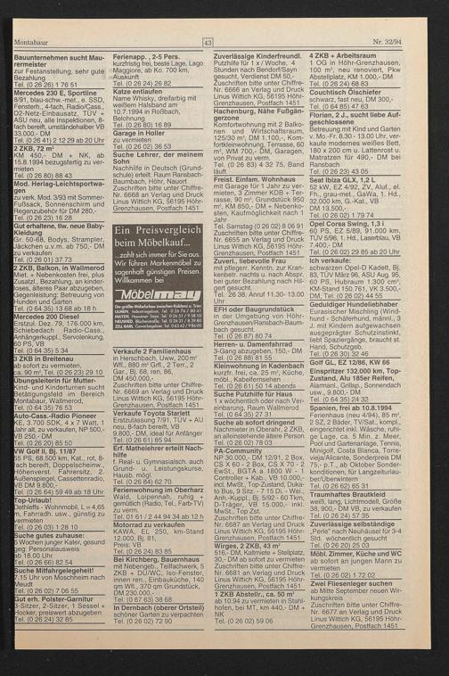 Putzhilfe für 1 x / Woche, 4 Stunden nach Bendorf/Sayn gesucht, Verdienst DM 50,- Zuschriften bitte unter Chiffre- Nr. 6666 an Verlag und Druck Linus Wittich KG, 56195 Höhr- Grenzhausen, Postfach 1451