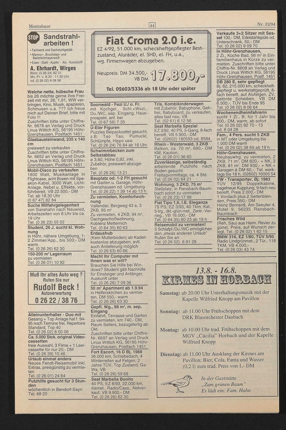 Höhr-Grenzhausen, Neubauwhg. zu vermieten, 2 ZKB, 71 m 2 , DM 820,- + NK, 3 ZKB, 81 m 2 , DM 930,- + NK + Garagen ä DM 60,-, Tel. werk- tags bis 18 h, (02602) 16005 54