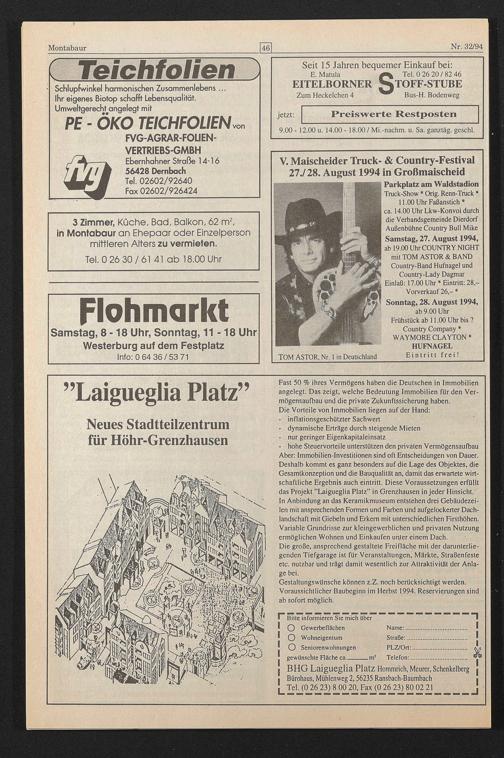 Truck-Show * Orig. Renn-Truck * 11.00 Uhr Faßanstich * ca. 14.00 Uhr Lkw-Konvoi durch die Verbandsgemeinde Dierdorf Außenbühne Country Bull Mike Samstag, 27. August 1994, ab 19.00 Uhr COUNTRY NIGHT mit TOM ASTOR & BAND Country-Band Hufnagel und Country-Lady Dagmar Einlaß: 17.00 Uhr * Eintritt: 28,- Vorverkauf 26,- * Sonntag, 28. August 1994, ab 9.00 Uhr