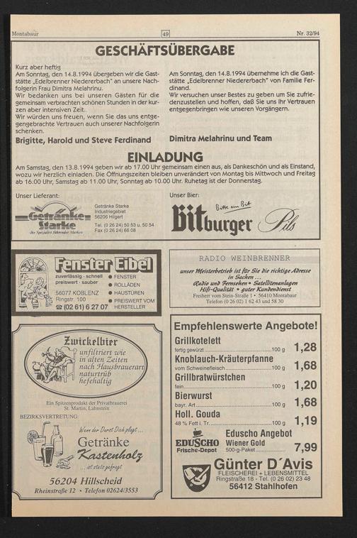 Am Sonntag, den 14.8.1994 übergeben wir die Gaststätte „Edelbrenner Niedererbach” an unsere Nachfolgerin Frau Dimitra Melahrinu.