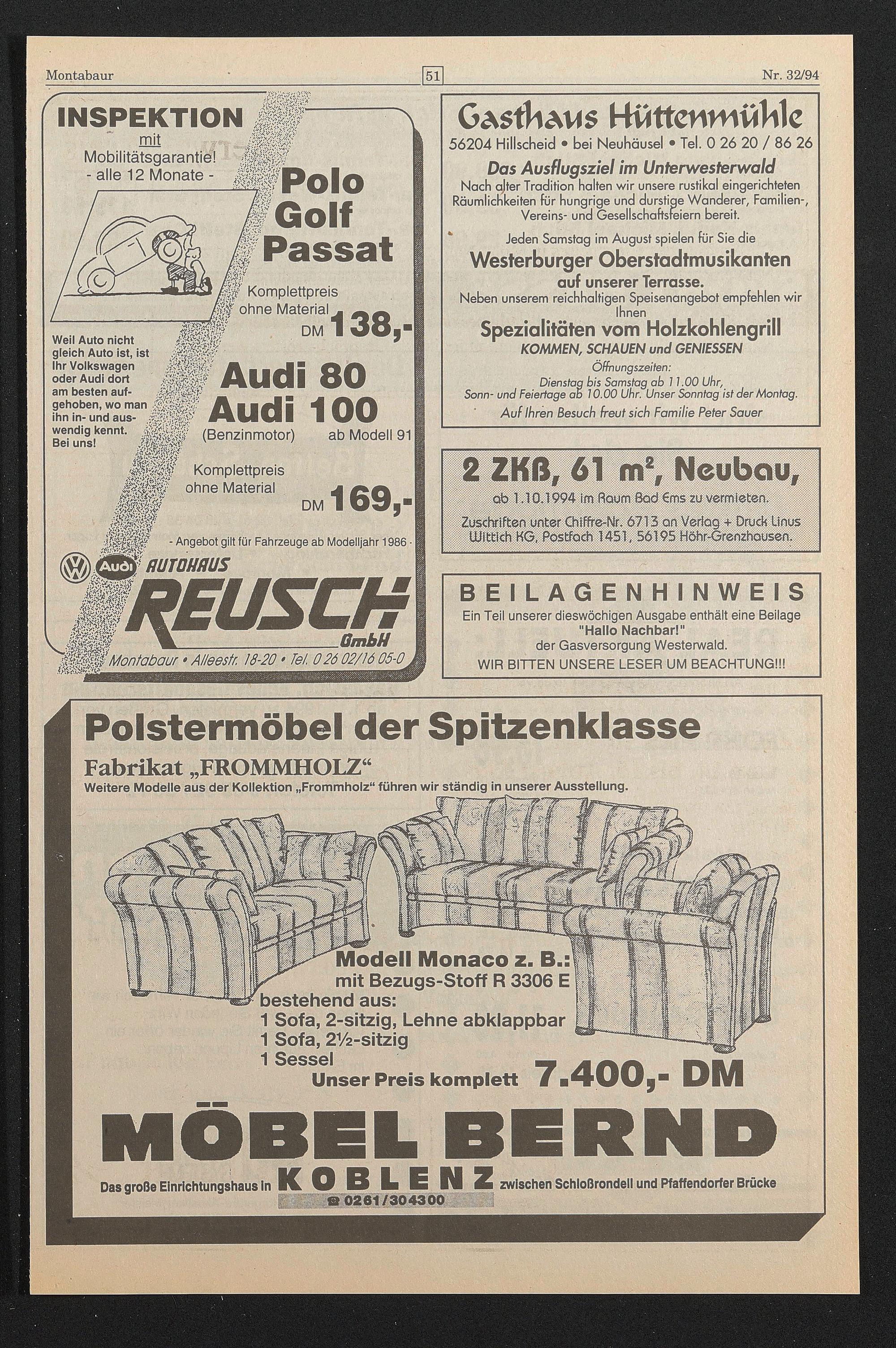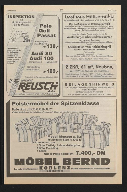 Ein Teil unserer dieswöchigen Ausgabe enthält eine Beilage "Hallo Nachbar!" der Gasversorgung Westenwald.