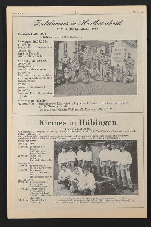 Von Samstag, 27. August, bis Montag, 29. August 1994, findet rund um die Buchfinkenlandhalle die traditionelle Hübinger Kirmes statt.