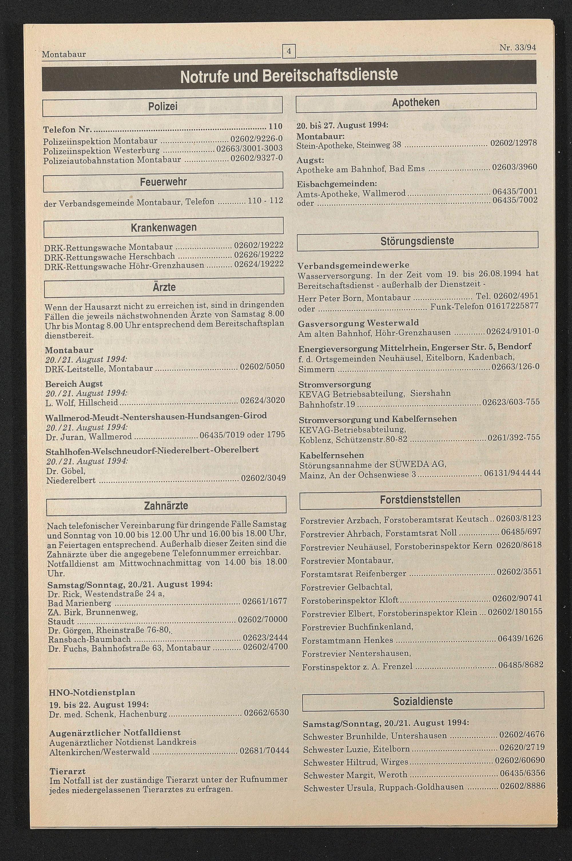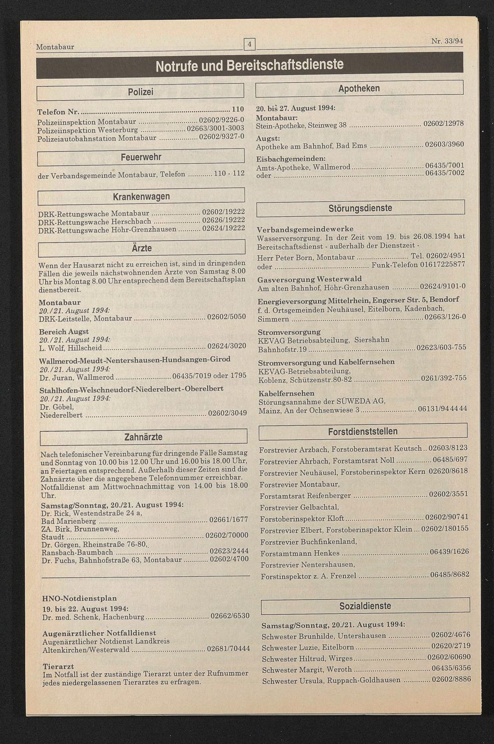 HNO-Notdienstplan 19. bis 22. August 1994: