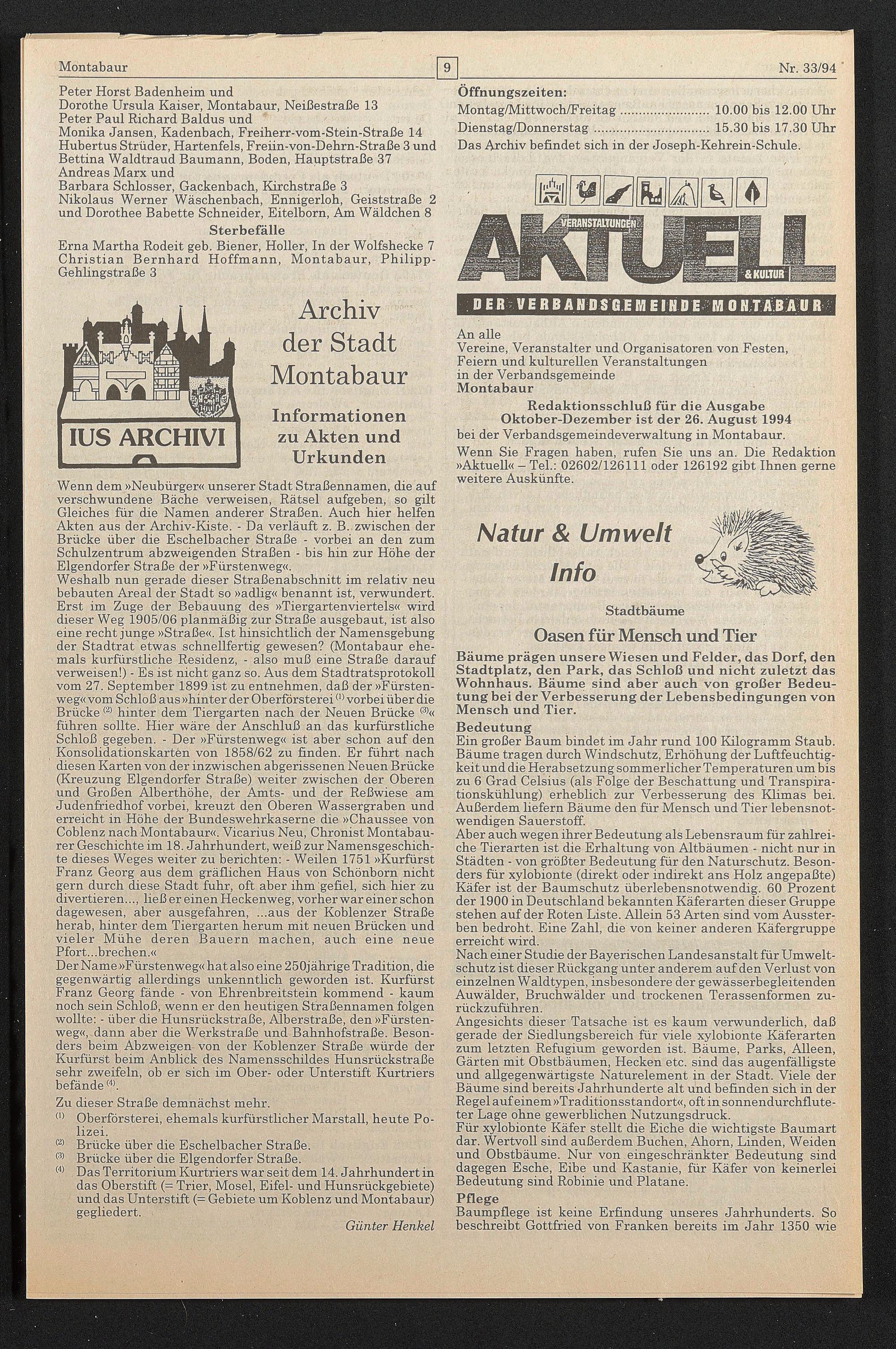 Redaktionsschluß für die Ausgabe Oktober-Dezember ist der 26. August 1994 bei der Verbandsgemeindeverwaltung in Montabaur.