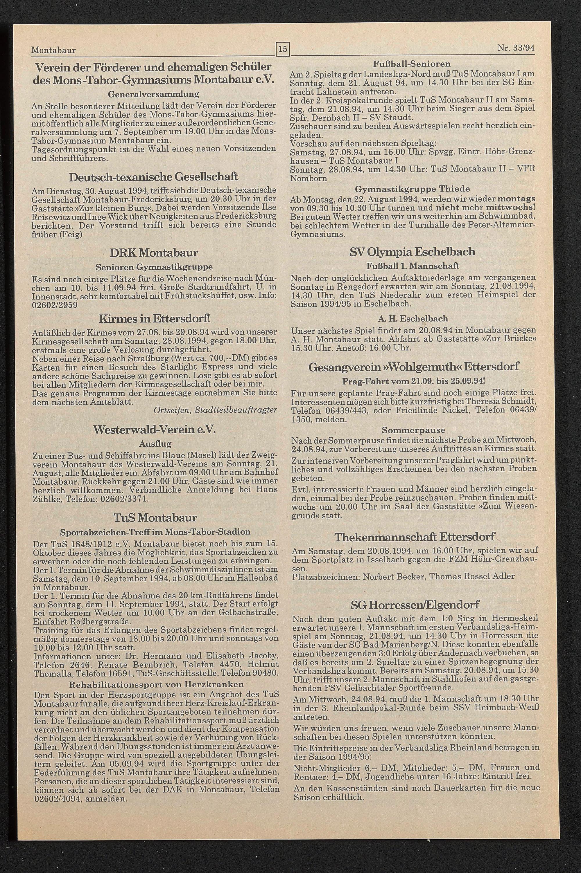 Unser nächstes Spiel findet am 20.08.94 in Montabaur gegen A. H. Montabaur statt. Abfahrt ab Gaststätte »Zur Brücke«