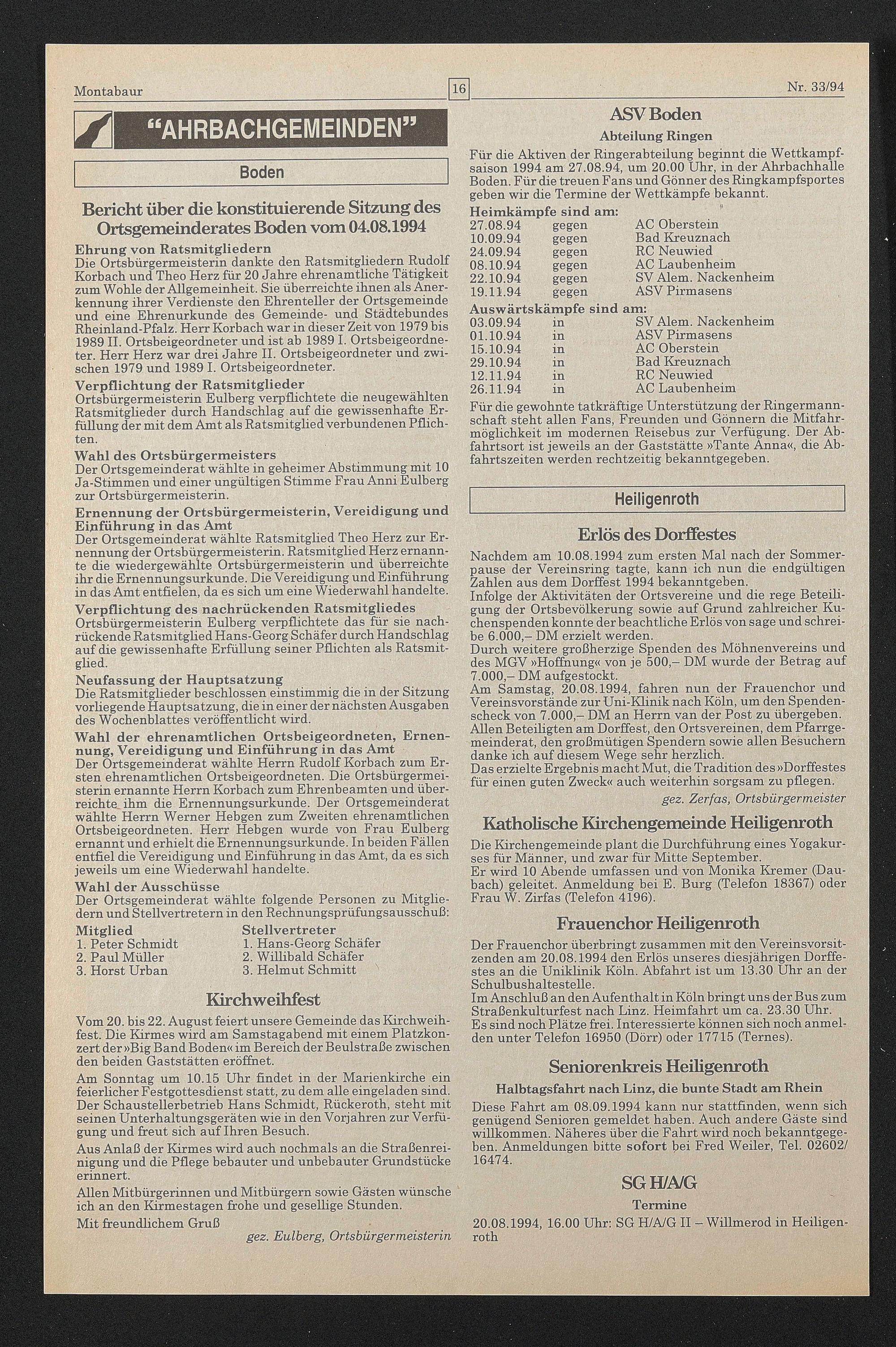 Bericht über die konstituierende Sitzung des Ortsgemeinderates Boden vom 04.08.1994