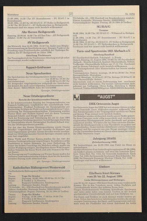 Hierfür erbitten wir Eure Anmeldung his spätestens 27.08.1994, um konkret planen zu können, und zwar für Gemeinde Eitelborn: Doris Heil, Tel. 1333, für Gemeinde Kadenbach: Erich Fries, Tel. 1385, für Gemeinde Neuhäusel: Rosi Schneider, Tel. 8500, für Gemeinde Simmern: Marlene Ullrich, Tel. 1330. Neubürger sind herzlich willkommen!