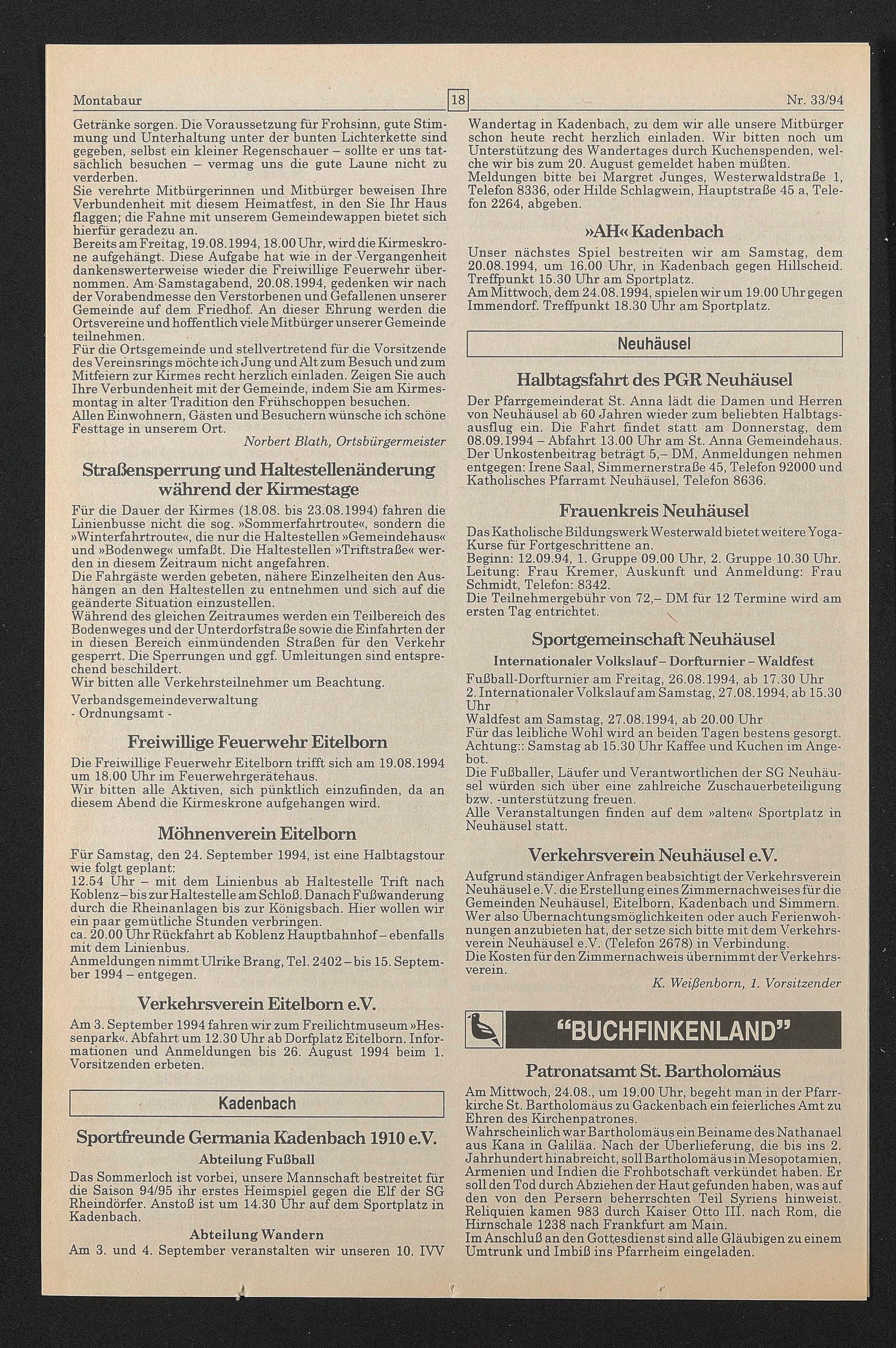 Der Pfarrgemeinderat St. Anna lädt die Damen und Herren von Neuhäusel ab 60 Jahren wieder zum beliebten Halbtagsausflug ein. Die Fahrt findet statt am Donnerstag, dem 08.09.1994 - Abfahrt 13.00 Uhr am St. Anna Gemeindehaus. Der Unkostenbeitrag beträgt 5,— DM, Anmeldungen nehmen entgegen: Irene Saal, Simmernerstraße 45, Telefon 92000 und Katholisches Pfarramt Neuhäusel, Telefon 8636.
