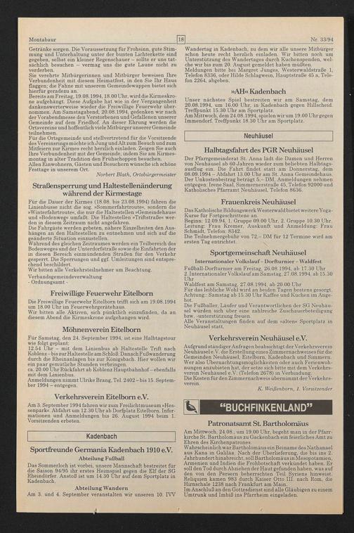 Bereits am Freitag, 19.08.1994,18.00 Uhr, wird die Kirmeskrone aufgehängt. Diese Aufgabe hat wie in der Vergangenheit dankenswerterweise wieder die Freiwillige Feuerwehr übernommen. Am'Samstagabend, 20.08.1994, gedenken wir nach der Vorabendmesse den Verstorbenen und Gefallenen unserer Gemeinde auf dem Friedhof. An dieser Ehrung werden die Ortsvereine und hoffentlich viele Mitbürger unserer Gemeinde teilnehmen.