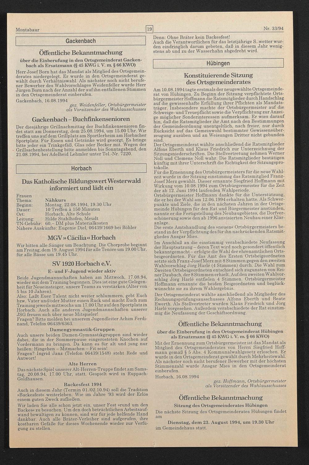 Am 10.08.1994 tagte erstmals der neugewählte Ortsgemeinderat von Hübingen. Zu Beginn der Sitzung verpflichtete Ortsbürgermeister Hoffmann die Ratsmitglieder durch Handschlag auf die gewissenhafte Erfüllung ihrer Pflichten als Mandatsträger. Insbesondere machte der Ortsbürgermeister auf die Schweige- und Treuepflicht sowie die Verpflichtung zur Anzeige möglicher Sonderinteressen aufmerksam. Er wies darauf hin, daß die Ratsmitglieder ihr Amt nach den Bestimmungen der Gemeindeordnung unentgeltlich, nach freier, nur durch Rücksicht auf das Gemeinwohl bestimmter Gewissensüberzeugung ausüben und an Weisungen Dritter nicht gebunden sind.