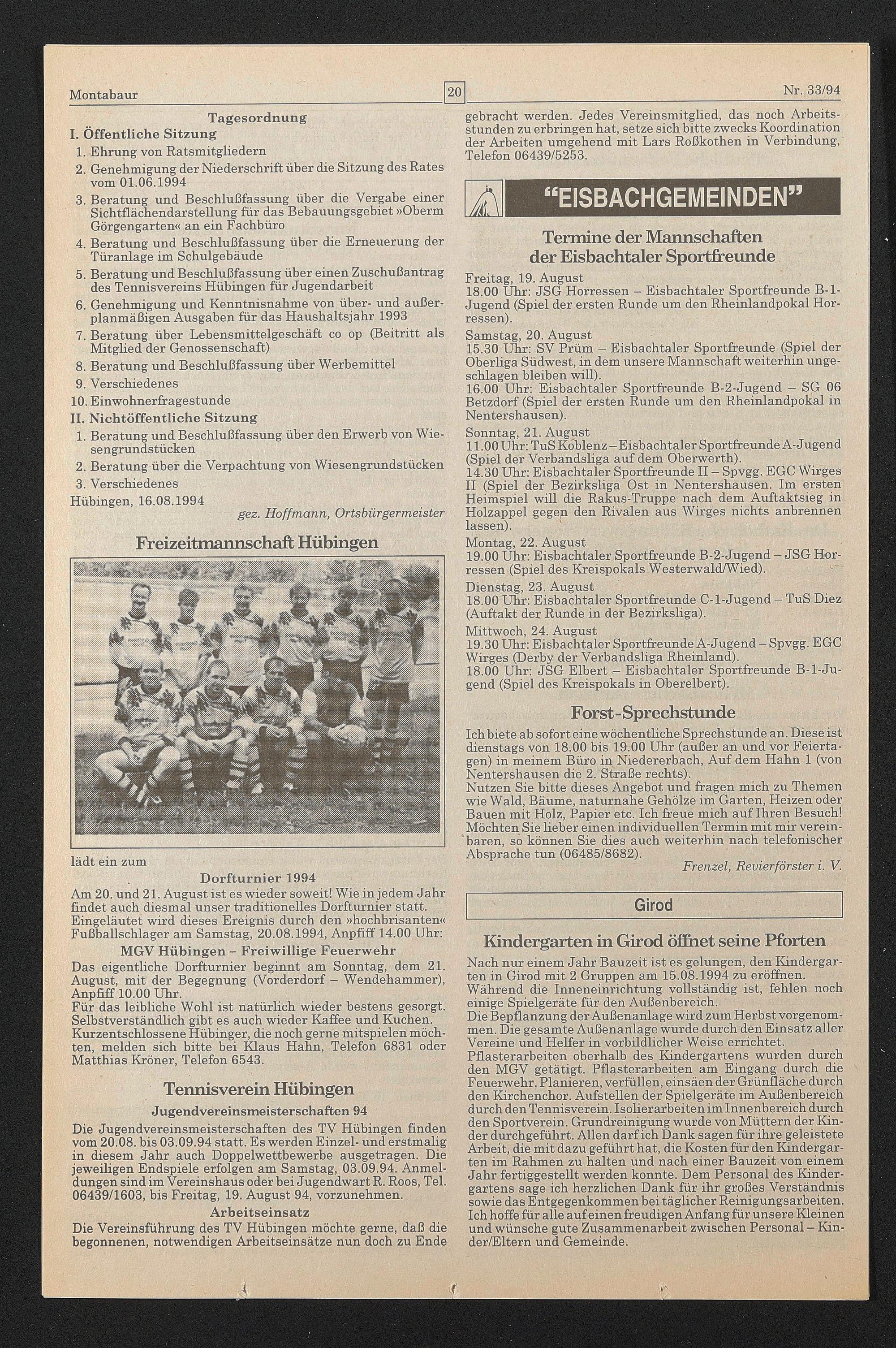 Am 20. und 21. August ist es wieder soweit! Wie in jedem Jahr findet auch diesmal unser traditionelles Dorfturnier statt. Eingeläutet wird dieses Ereignis durch den »hochbrisanten« Fußballschlager am Samstag, 20.08.1994, Anpfiff 14.00 Uhr: