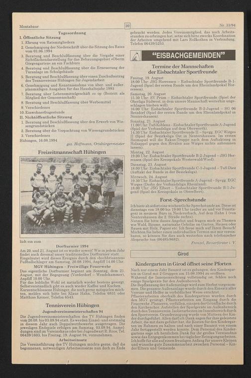 Jugendvereinsmeisterschaften 94 Die Jugendvereinsmeisterschaften des TV Hübingen finden vom 20.08. bis 03.09.94 statt. Es werden Einzel- und erstmalig in diesem Jahr auch Doppelwettbewerbe ausgetragen. Die jeweiligen Endspiele erfolgen am Samstag, 03.09.94. Anmeldungen sind im Vereinshaus oder bei Jugendwart R. Roos, Tel. 06439/1603, bis Freitag, 19. August 94, vorzunehmen.