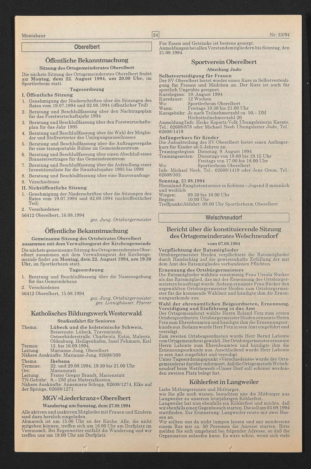 Die nächste gemeinsame Sitzung des Ortsgemeinderates Oberelbert zusammen, mit dem Verwaltungsrat der Kirchengemeinde findet am Montag, dem 22. August 1994, um 19.30 Uhr, im Sportlerheim statt.