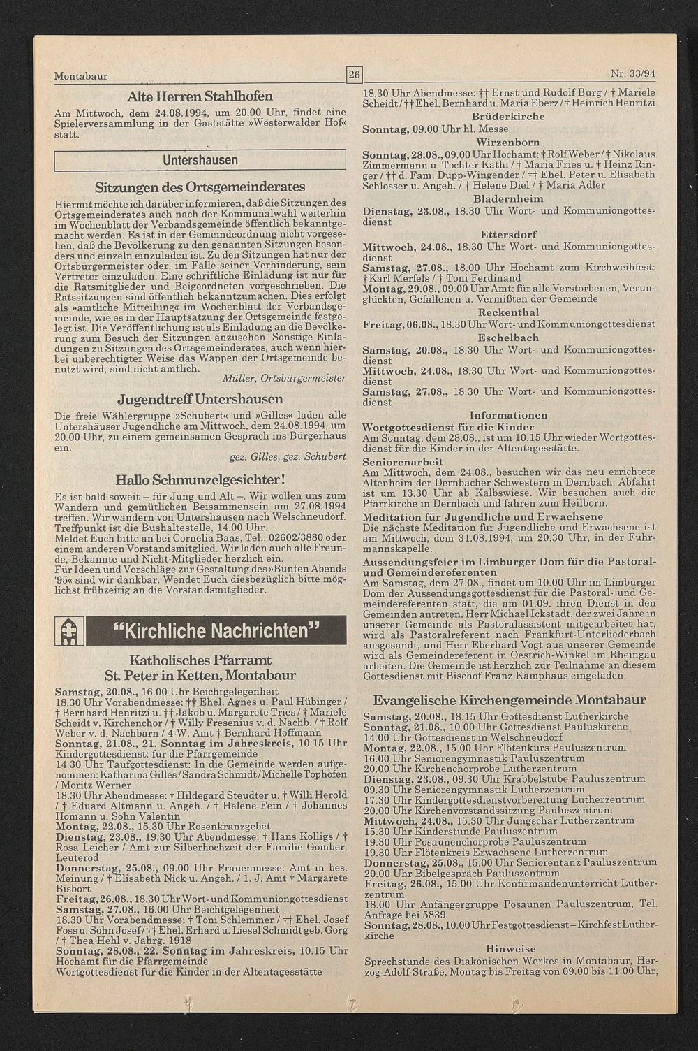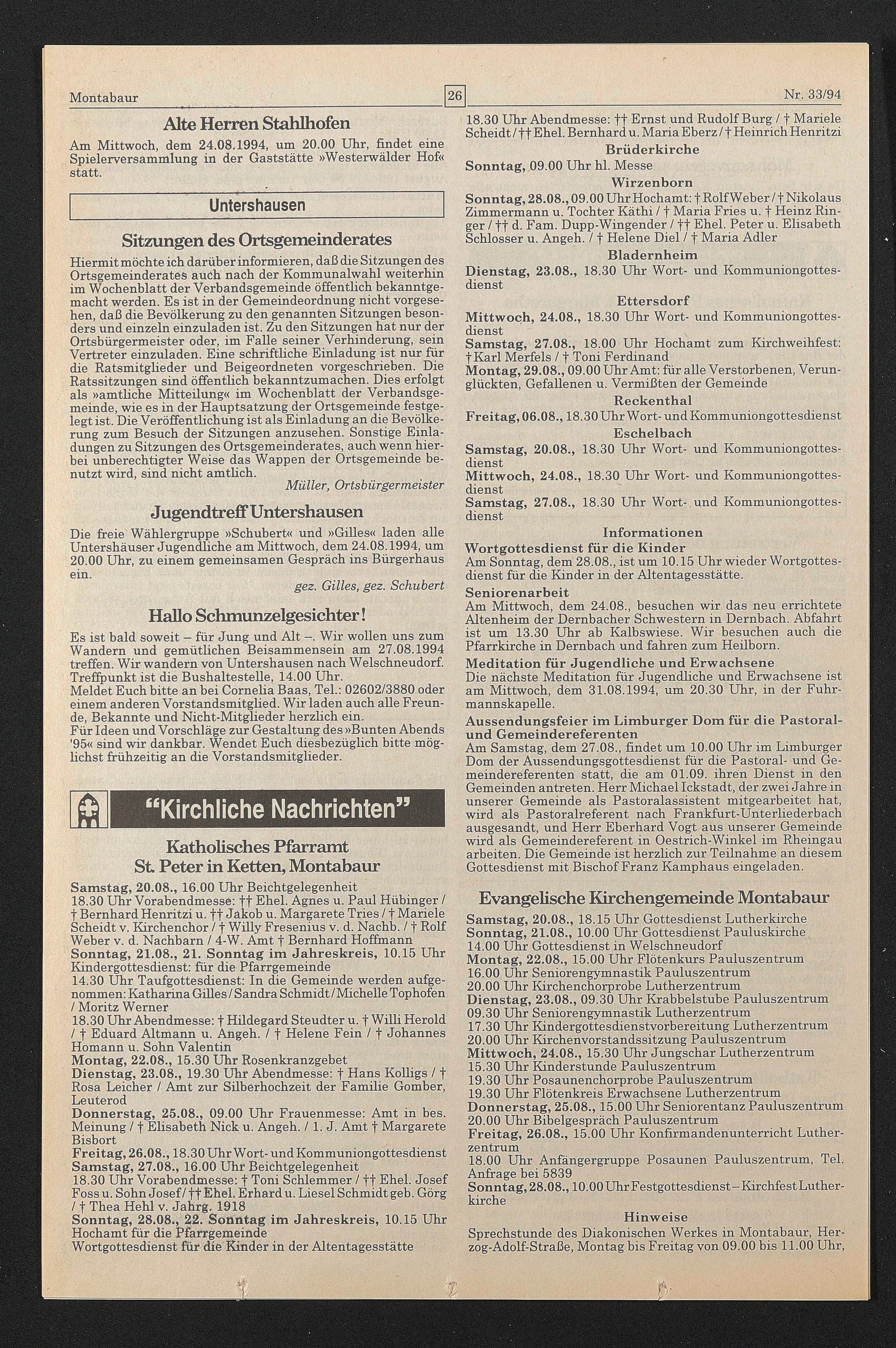 Die freie Wählergruppe »Schubert« und »Gilles« laden alle Untershäuser Jugendliche am Mittwoch, dem 24.08.1994, um 20.00 Uhr, zu einem gemeinsamen Gespräch ins Bürgerhaus ein.