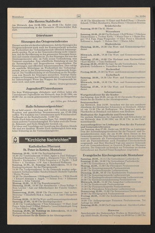 Sonntag, 28.08., 09.00 Uhr Hochamt: f Rolf Weber / f Nikolaus Zimmermann u. Tochter Käthi / f Maria Fries u. f Heinz Ringer / ft d. Farn. Dupp-Wingender / ff Ehel. Peter u. Elisabeth Schlosser u. Angeh. / f Helene Diel / f Maria Adler Bladernheim