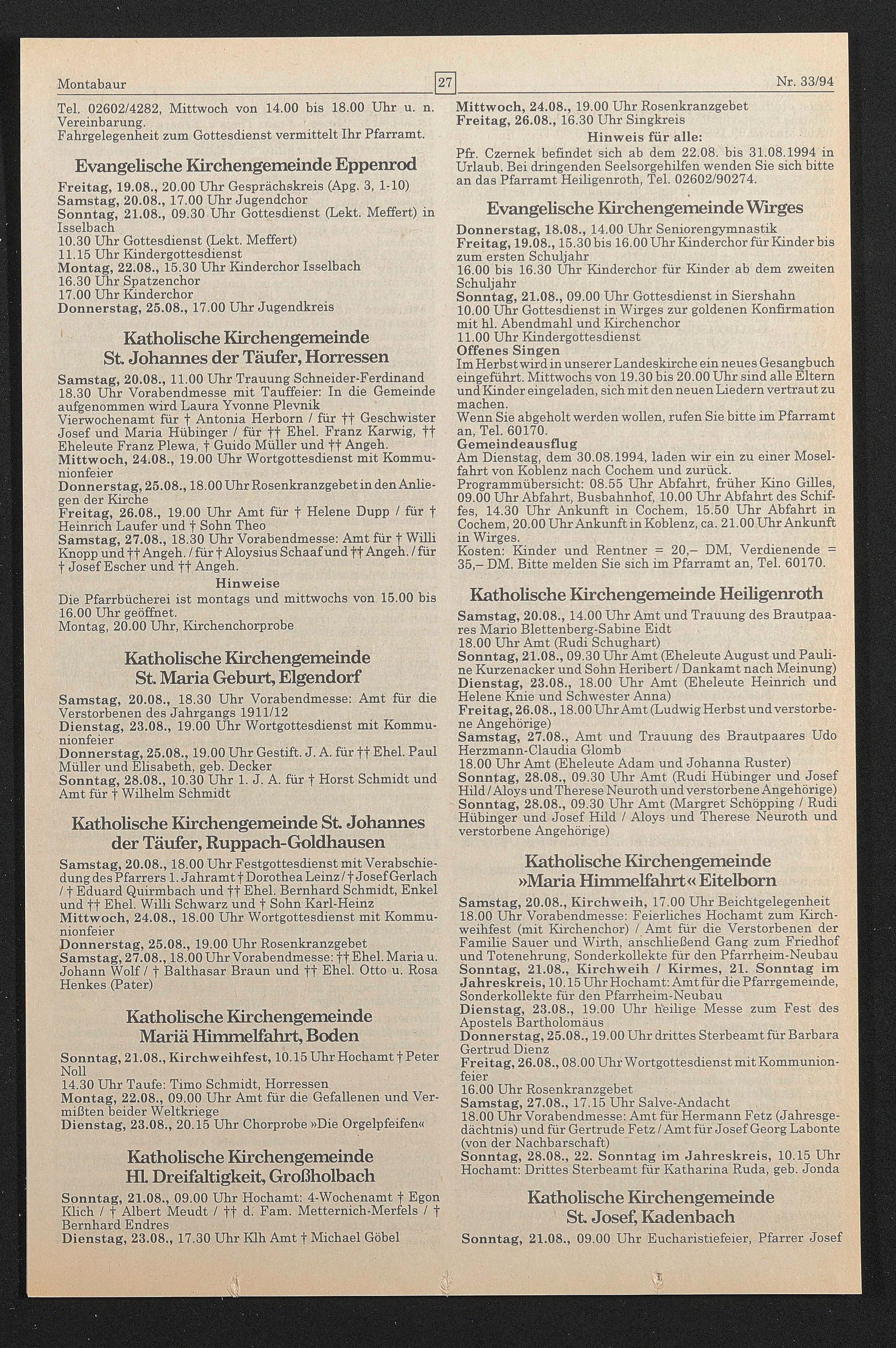 Pfr. Czernek befindet sich ab dem 22.08. bis 31.08.1994 in Urlaub. Bei dringenden Seelsorgehilfen wenden Sie sich bitte an das Pfarramt Heiligenroth, Tel. 02602/90274.