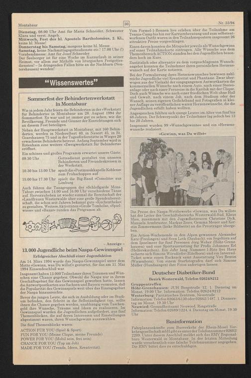 Wie in jedem Jahr feiern die Behinderten in der »Werkstatt für Behinderte« in Montabaur am 28. August 1994 ihr Sommerfest. Es war und ist immer gut zu sehen, wie die Bevölkerung, Freunde und Gönner der Einrichtungen sich an diesem Fest beteiligen.