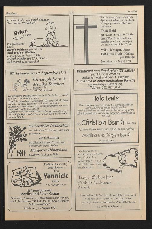 Bekannte, Freunde und Nachbarn laden wir ein, am 9. September 1994 ab 19.30 Uhr auf unseren Sohn anzustoßen.