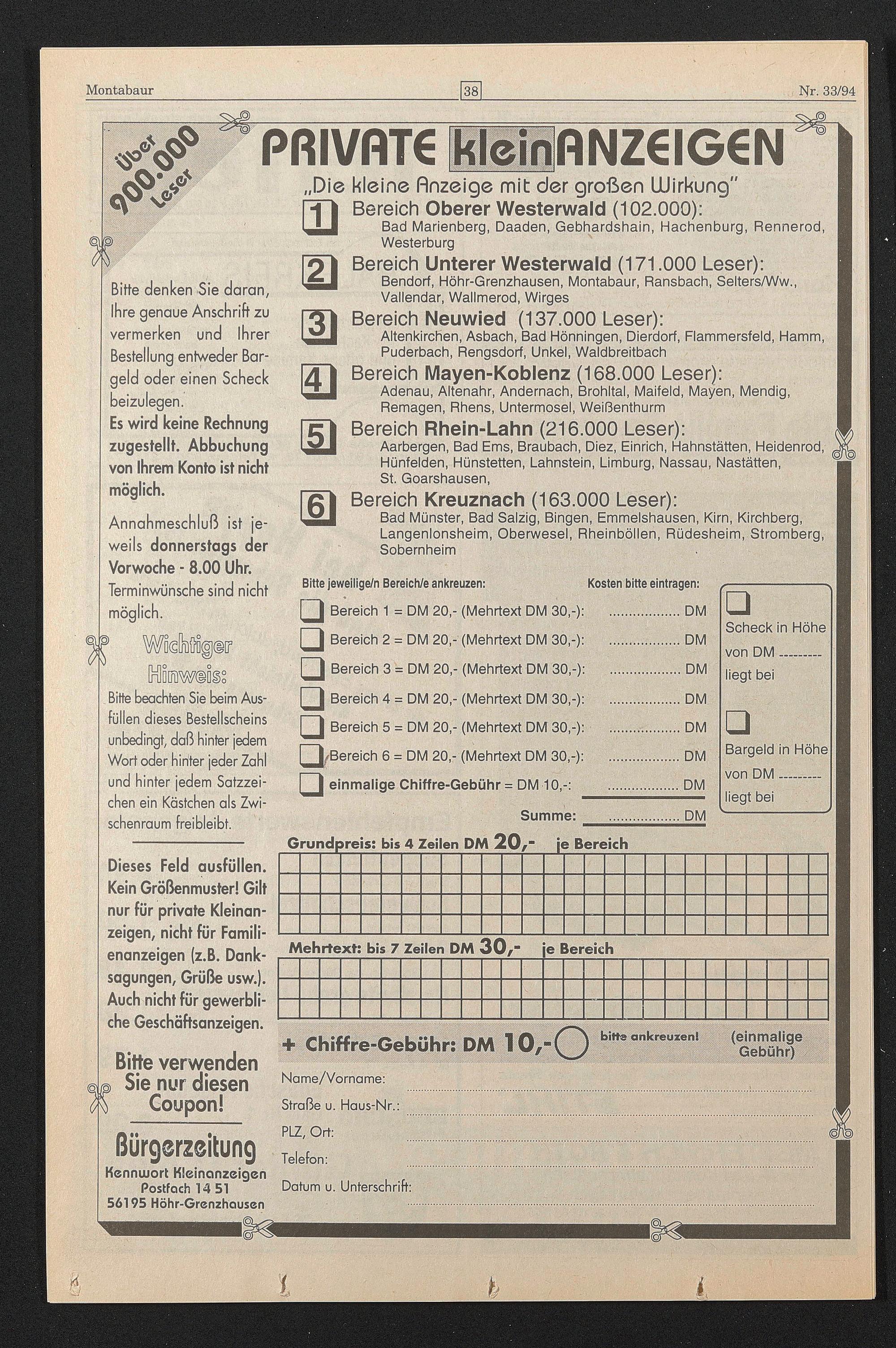 Bereich 1 = DM 20,- (Mehrtext DM 30,-) Bereich 2 = DM 20,- (Mehrtext DM 30,-) Bereich 3 = DM 20,- (Mehrtext DM 30,-) Bereich 4 = DM 20,- (Mehrtext DM 30,-) Bereich 5 = DM 20,- (Mehrtext DM 30,-) (^^Bereich 6 = DM 20,- (Mehrtext DM 30,-) □ einmalige Chiffre-Gebühr = DM 10,-: