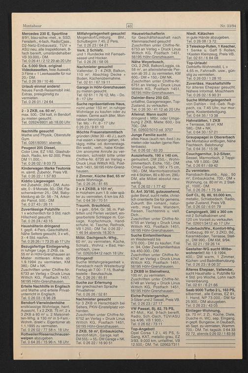 Zuschriften unter Chiffre-Nr. 6755 an Verlag + Druck Linus Wittich KG, Postfach 1451, 56195 Höhr-Grenzhausen. Suche Einfamilienhaus im Westerwald bis 370.000,- DM zu kaufen. Frei in '94. Oder Zweifamilienhaus bis 450.000,- DM.