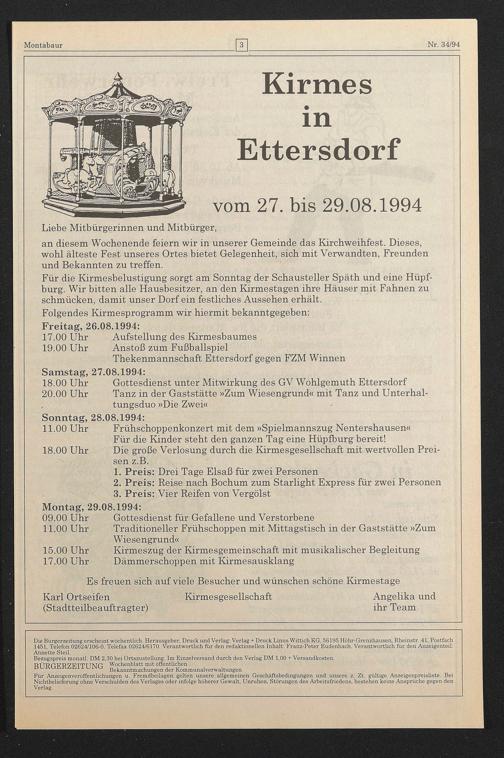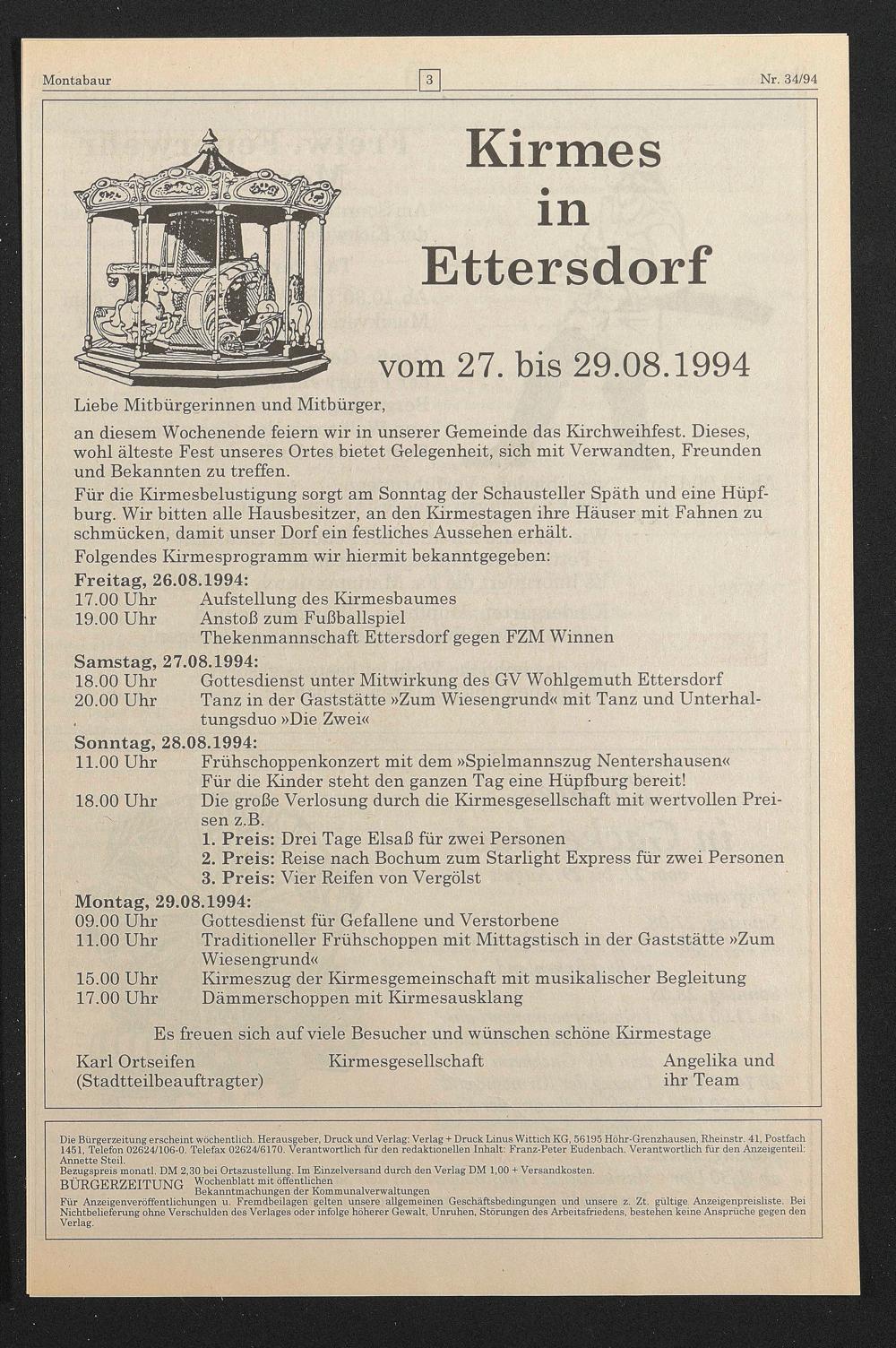 Die Bürgerzeitung erscheint wöchentlich. Herausgeber, Druck und Verlag: Verlag + Druck Linus Wittich KG, 56195 Höhr-Grenzhausen, Rheinstr. 41, Postfach 1451, Telefon 02624/106-0. Telefax 02624/6170. Verantwortlich für den redaktionellen Inhalt: Franz-Peter Eudenbach. Verantwortlich für den Anzeigenteil: Annette Steil.