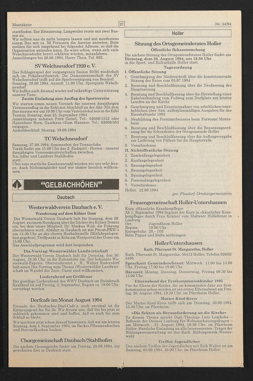 Die nächste Sitzung des Ortsgemeinderates Holler findet am Dienstag, dem 30. August 1994, um 19.30 Uhr in der Sport- und Kulturhalle Holler statt.