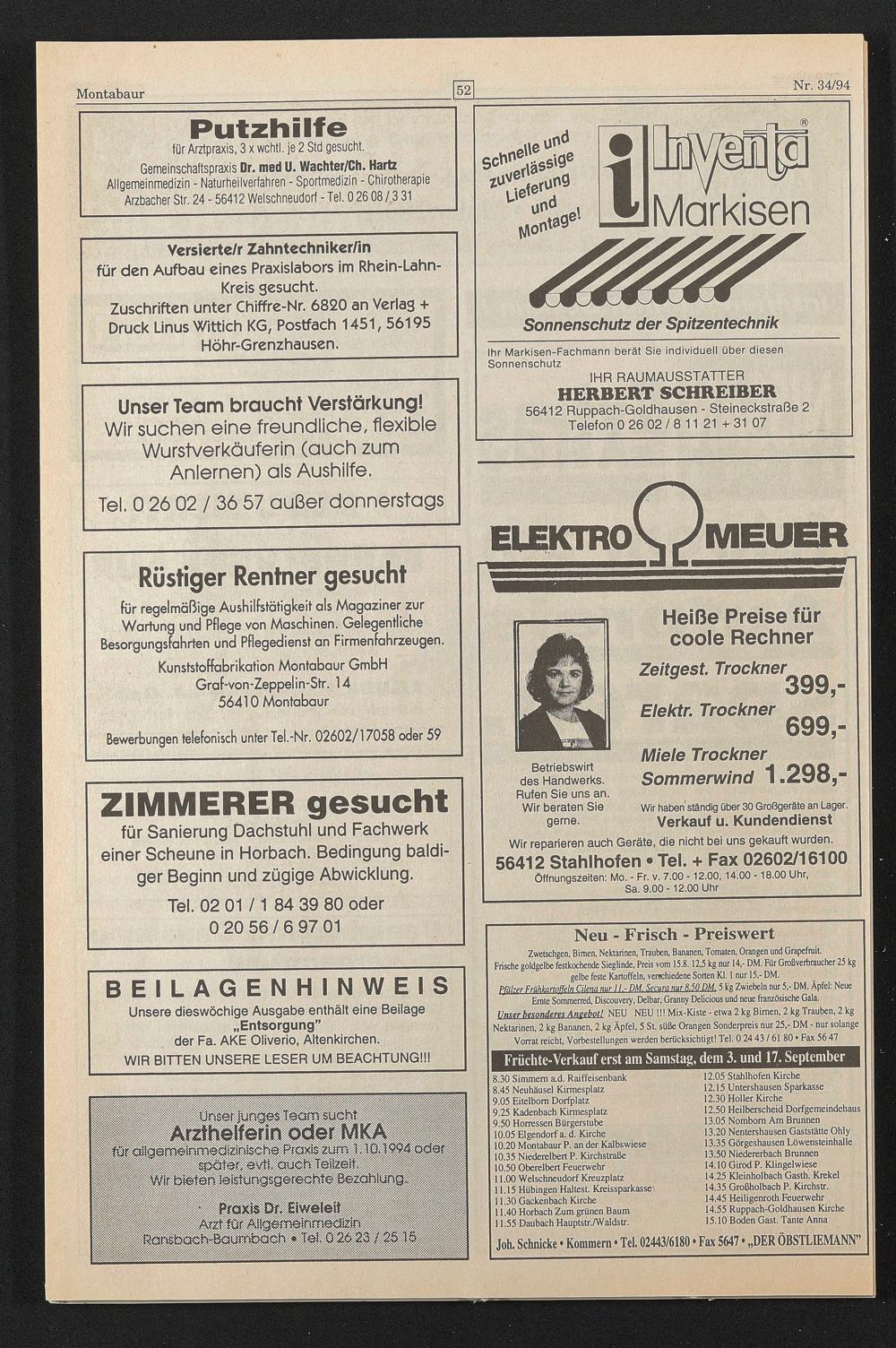 Zwetschgen, Birnen, Nektarinen, Trauben, Bananen, Tomaten, Orangen und Grapefruit Frische goldgelbe festkochende Sieglinde, Preis vom 15.8.12,5 kg nur 14,- DM. Für Großverbraucher 25 kg gelbe feste Kartoffeln, verschiedene Sorten Kl. 1 nur 15,- DM.