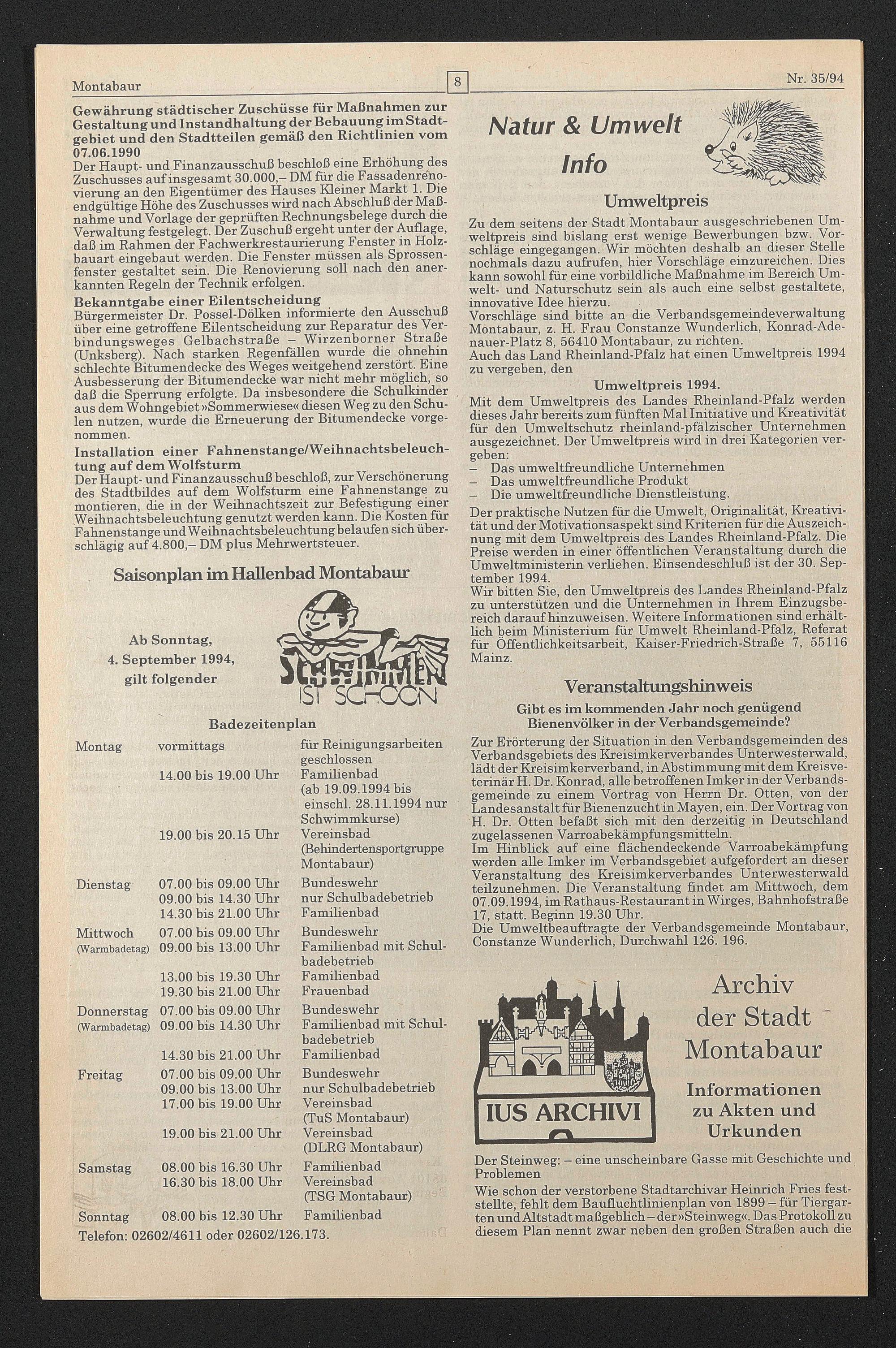 Zu dem seitens der Stadt Montabaur ausgeschriebenen Umweltpreis sind bislang erst wenige Bewerbungen bzw. Vorschläge eingegangen. Wir möchten deshalb an dieser Stelle nochmals dazu aufrufen, hier Vorschläge einzureichen. Dies kann sowohl für eine vorbildliche Maßnahme im Bereich Umwelt- und Naturschutz sein als auch eine selbst gestaltete, innovative Idee hierzu.