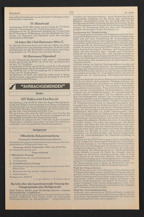 Vorgaben der Gemeindeordnung — durch Handschlag auf die gewissenhafte Erfüllung der mit ihrem Amt verbundenen Pflichten. Anschließend wurde der am 12.06.1994 von der Bevölkerung gewählte Ortsbürgermeister Paul Günter Zerfas zum Ehrenbeamten der Gemeinde für die kommende Wahlzeit ernannt. Die Ernennung nahm das dazu vom Gemeinderat gewählte Ratsmitglied Jürgen Esselmann vor.