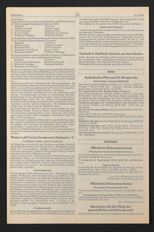 Mittwoch, 07.09.1994, 19.00 Uhr, Pfarrheim Mutter-Kind-Kreis: Dienstag, 06.09.1994, 15.30 Uhr, Pfarrheim