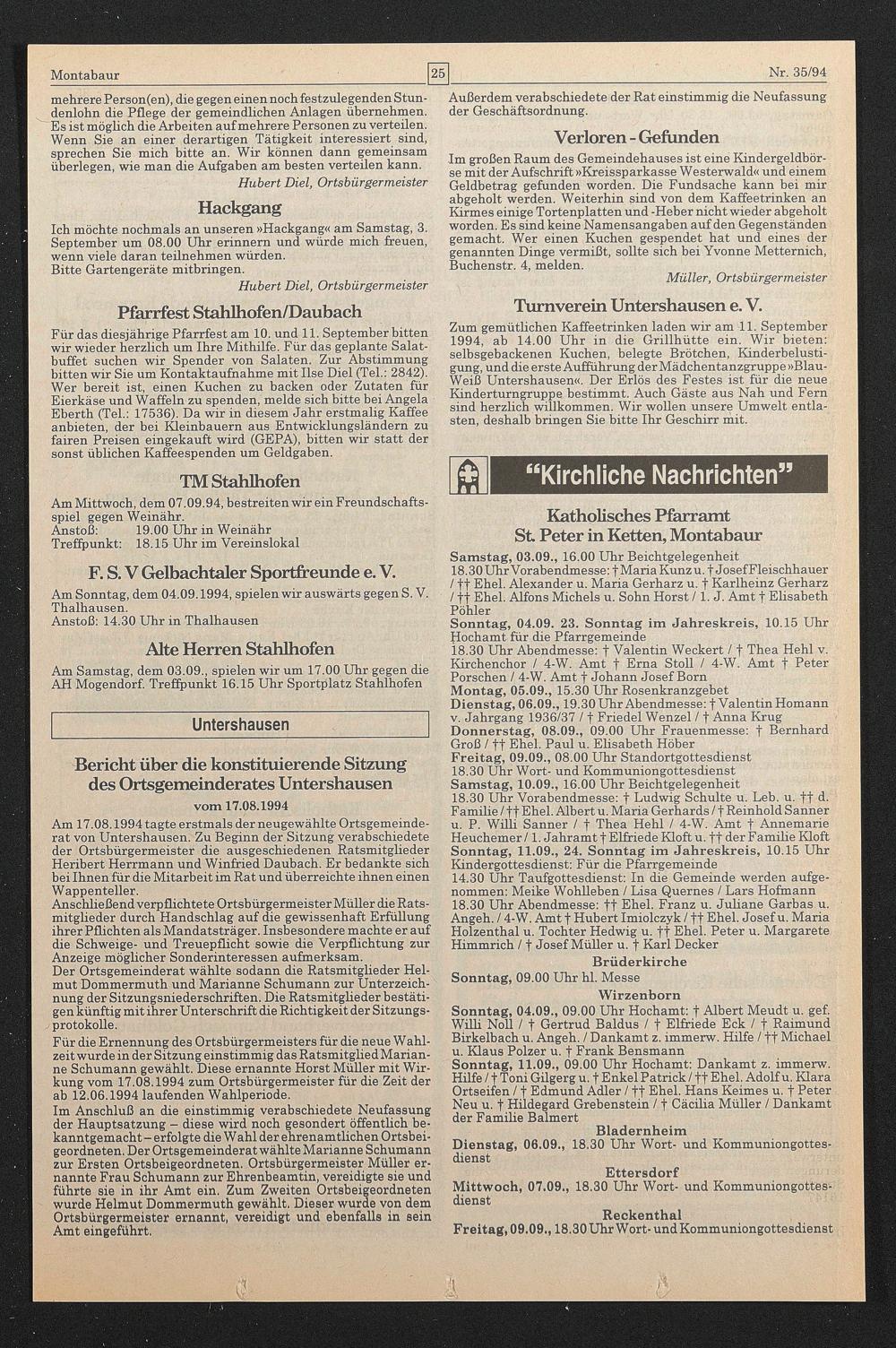 Für die Ernennung des Ortsbürgermeisters für die neue Wahlzeitwurde in der Sitzung einstimmig das RatsmitgliedMarian- ne Schumann gewählt. Diese ernannte Horst Müller mit Wirkung vom 17.08.1994 zum Ortsbürgermeister für die Zeit der ab 12.06.1994 laufenden Wahlperiode.