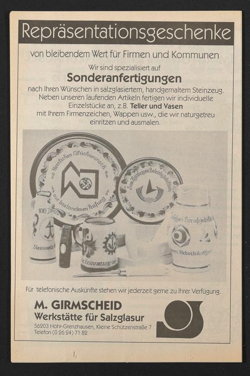 56203 Höhr-Grenzhausen, Kleine Schützenstraße 7 Telefon (0 26 24) 71 82
