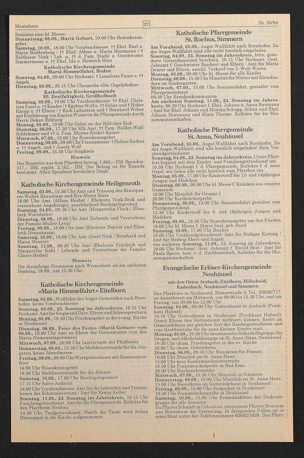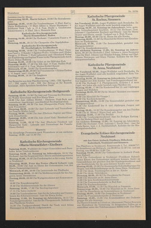Sonntag, 04.09., 23. Sonntag im Jahreskreis, 10.15 Uhr Hochamt: Amt für Siegmund Darr, Eltern und Schwiegereltern Montag, 05.09., 19.30 Uhr Friedensgebet in der evang. Kirche in Neuhäusel